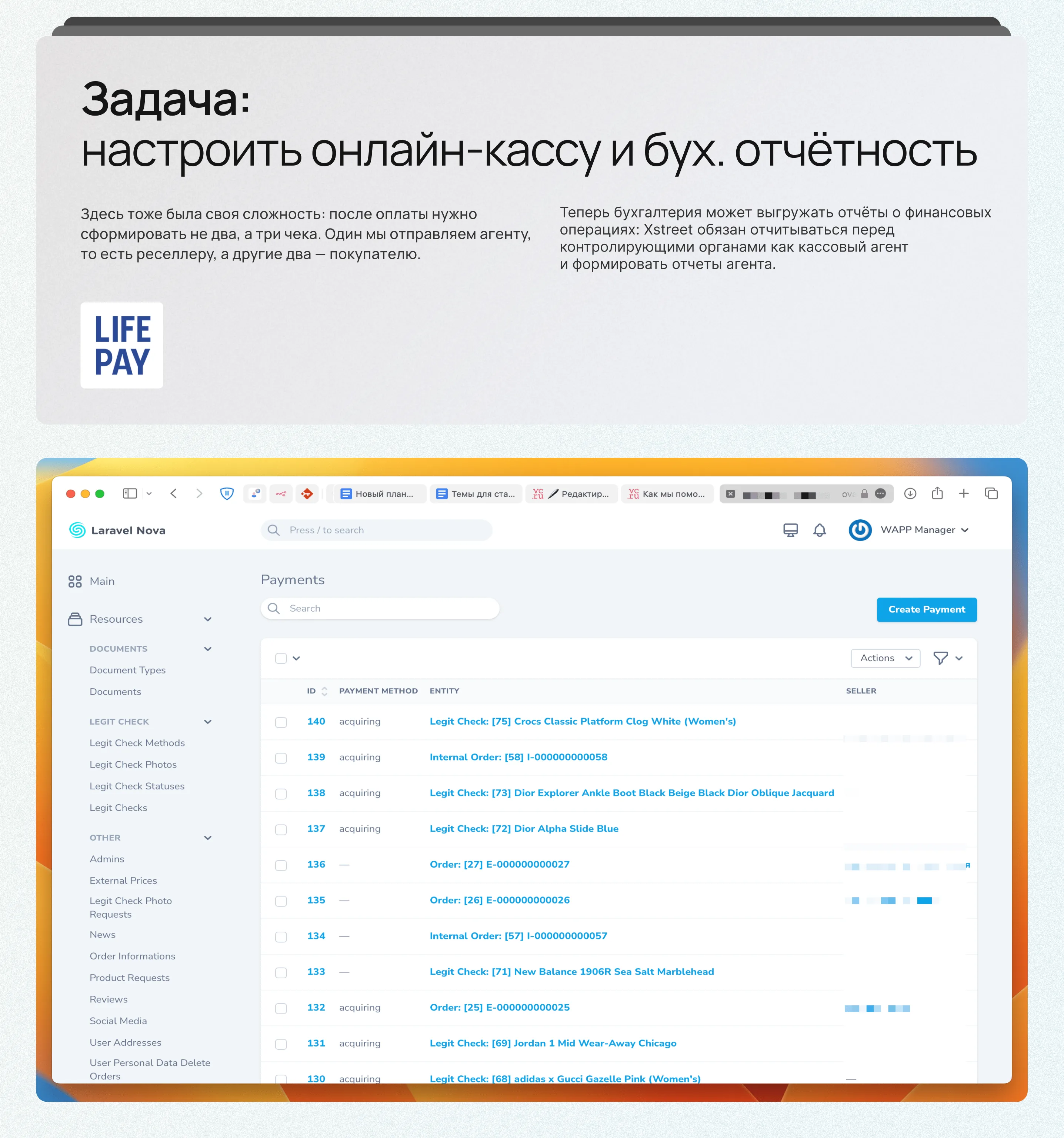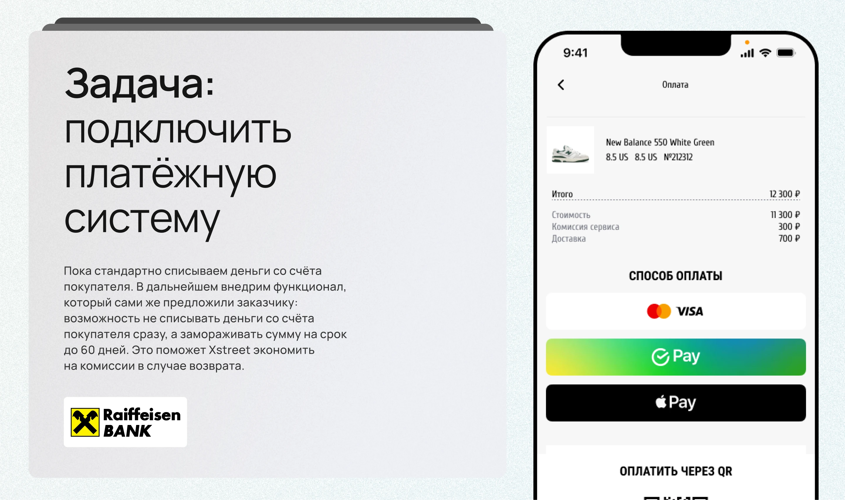 ➕ Подключить платёжную систему. Сейчас мы списываем деньги со счёта покупателя, а в дальнейшем внедрим функционал, который сами же предложили заказчику: возможность не списывать деньги со счёта покупателя сразу, а замораживать сумму на срок до 60 дней. Это поможет Хstreet экономить на комиссии в случае возврата.