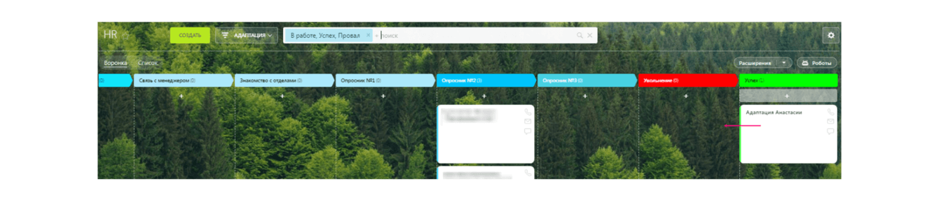 HR сдвигает карточку сотрудника из этапа «Успех» в этап «Увольнение» в воронке «Адаптация».
