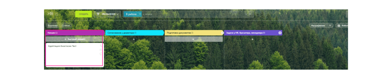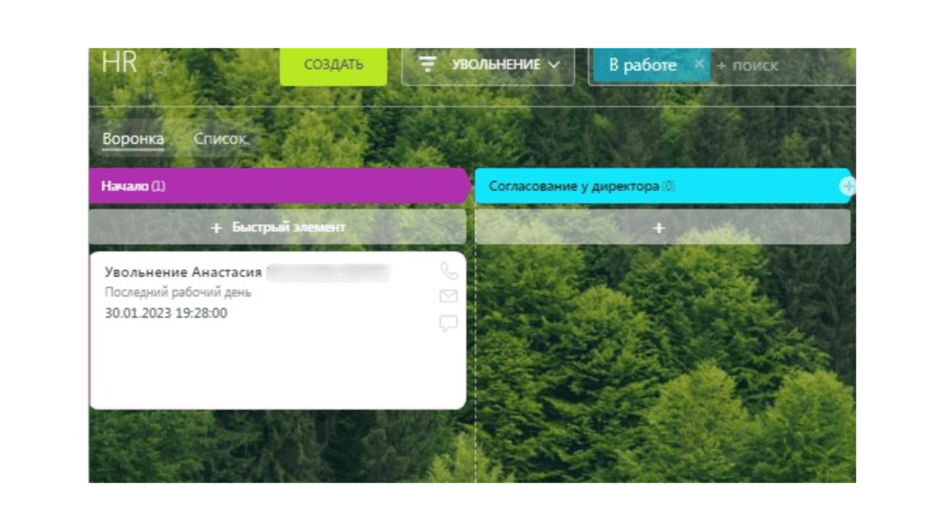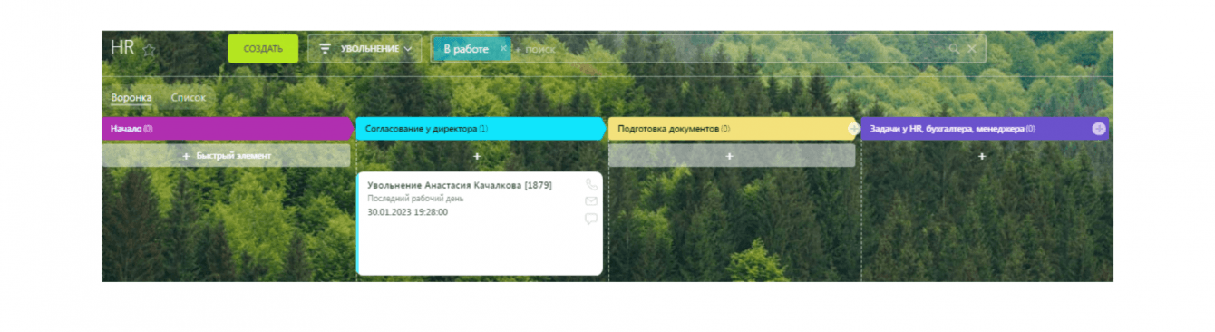 Карточка автоматически переносится в воронку «Увольнение» и запускается бизнес-процесс