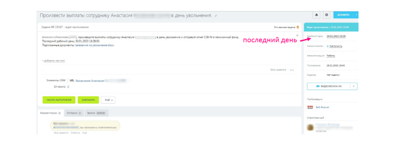 10. Бухгалтер оповещен когда у сотрудника последний рабочий день и ему автоматически проставлены задачи по выплатам и т.д.