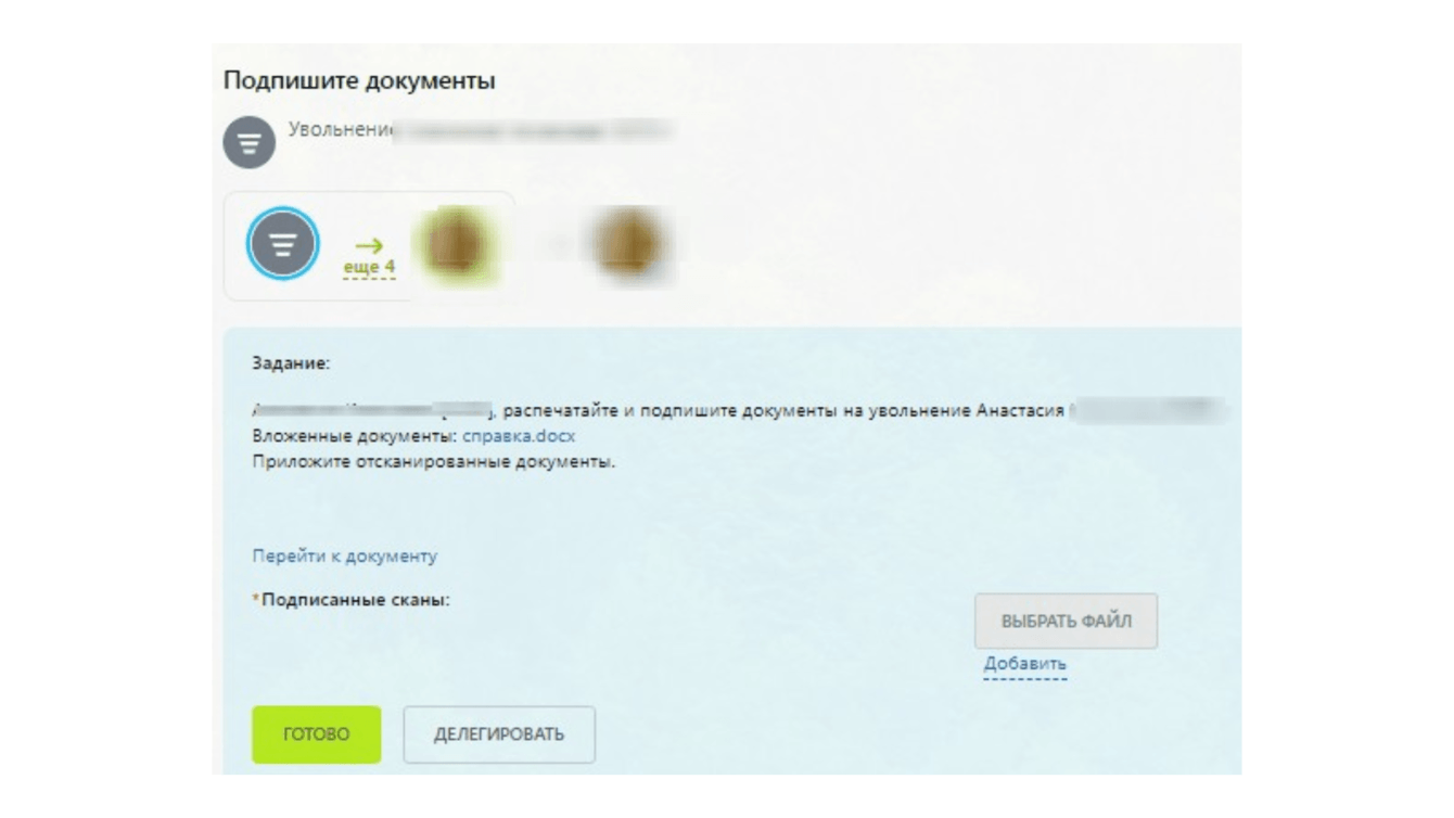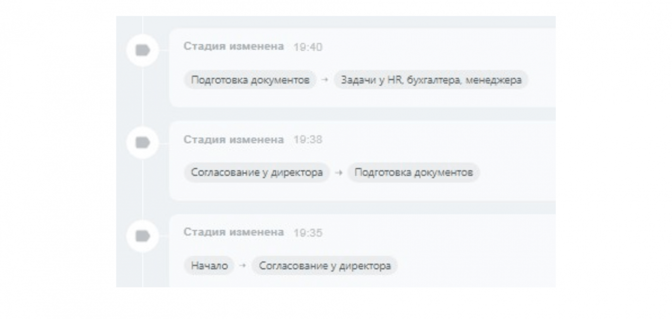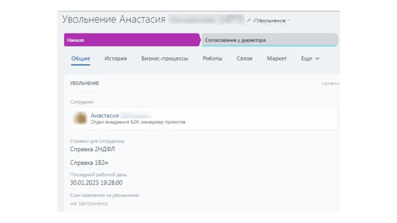 5. Ясно на каком этапе сейчас находится увольнение сотрудника (запуск процесса, согласование у директора и т.д). Карточка сама движется по этапам.