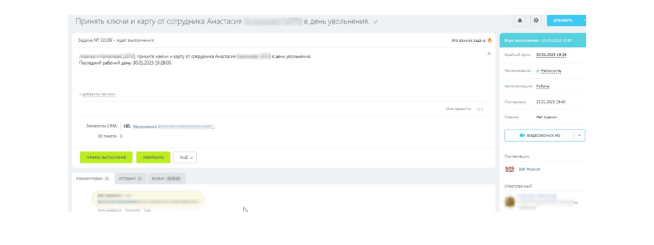 Автоматические задачи ответственным сотрудникам по приему ключей, карт, техники и закрытию доступов.