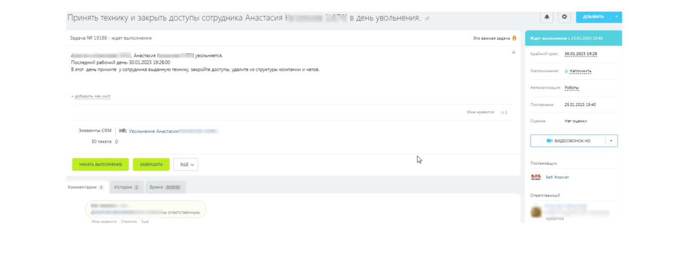 Автоматические задачи ответственным сотрудникам по приему ключей, карт, техники и закрытию доступов.
