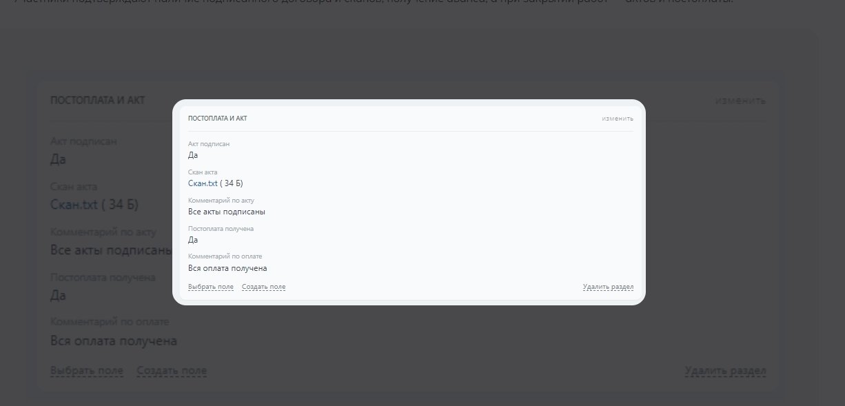 При этом каждый участник, который должен заполнить данные, получает «дело», в котором расписано что ему нужно заполнить для продвижения заказа далее по воронке.