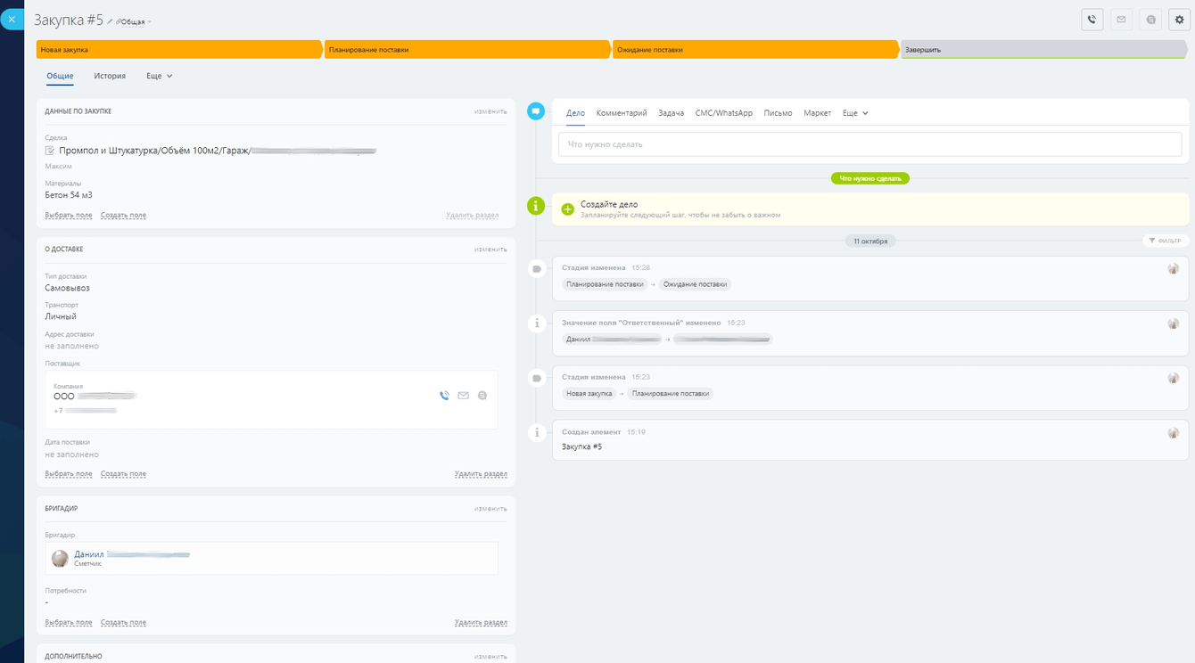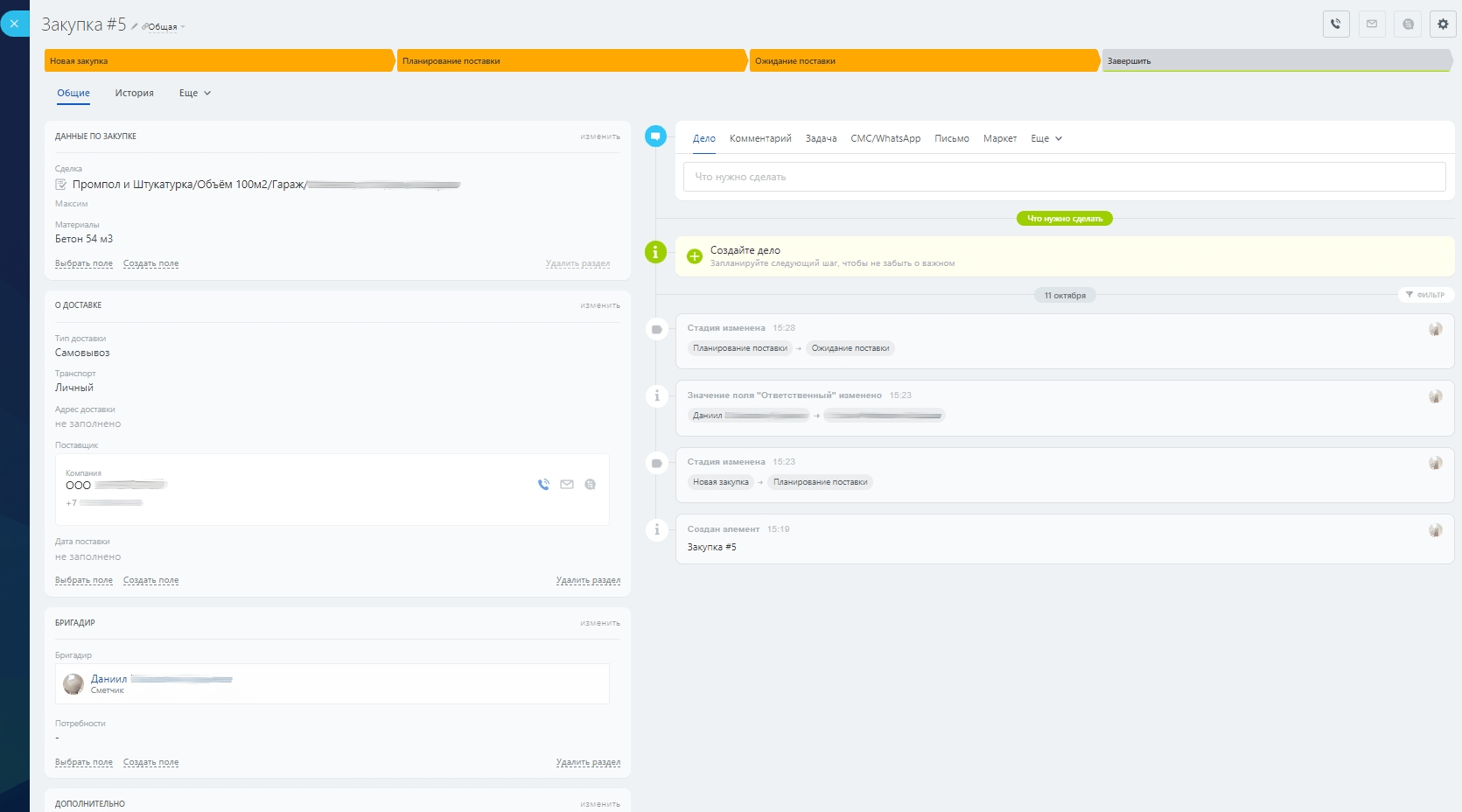 Сотрудники могут вносить данные о требуемых закупках в рамках заказа и далее вести закупку по воронке.