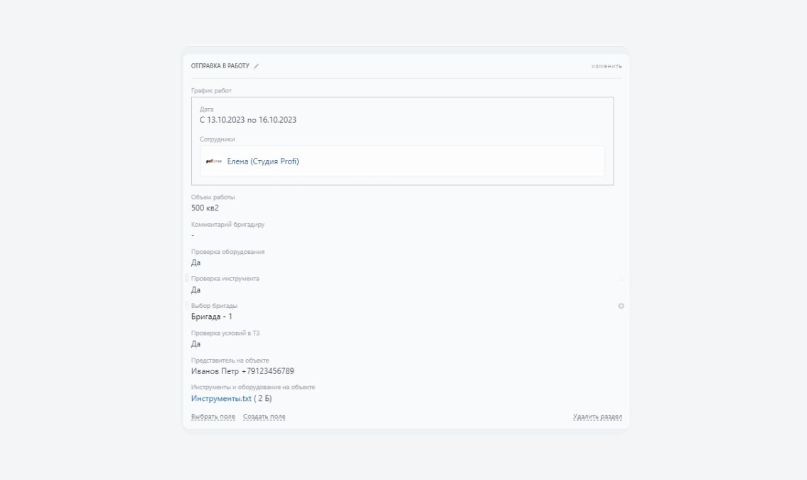 Все заполненные бригадиром в отчете данные попадают в отдельную карточку, к которой в последствии обращаются и другие участники процесса.