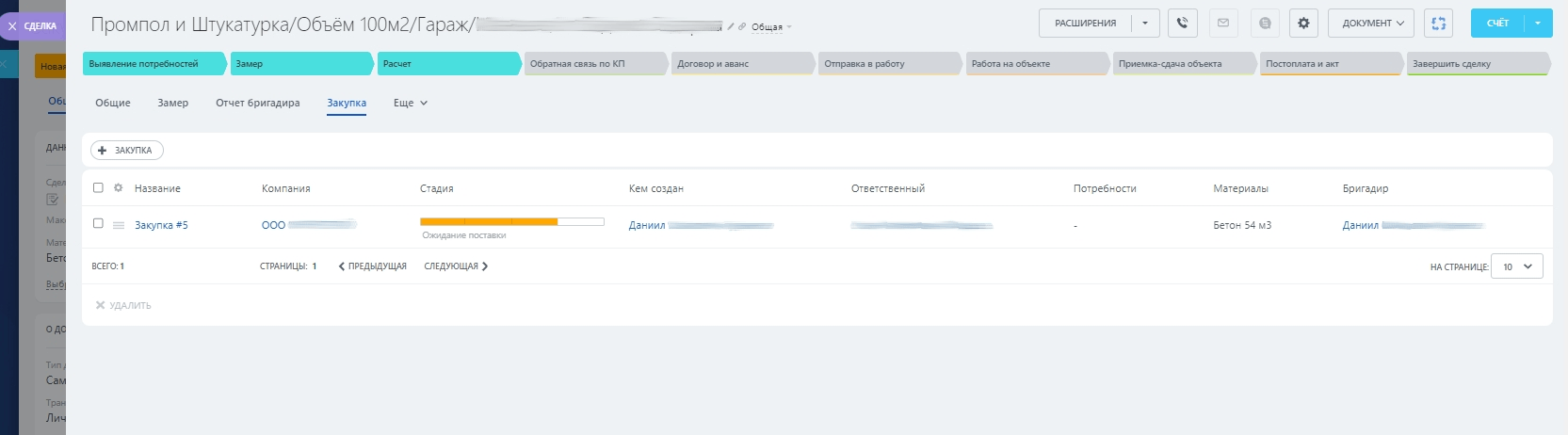 Аналогично замерам и отчетам бригадира, теперь менеджеры и руководители просматривают все новые, планируемые и доставленные закупки внутри заказа.