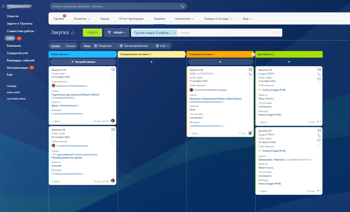 С учетом специфики работы настроили воронку по ведению заказов — от выявления потребностей и записи на замер до получения полной оплаты и актов.