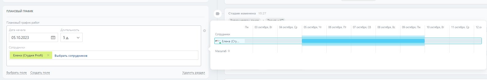 Менеджер заносит плановый и фактический график работ в карточку заказа. Сами графики аналогично можно увидеть в последствии на календаре.