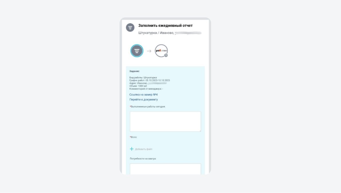 Бригадир отправляет ежедневно отчеты с мобильного телефона с возможностью отправки запроса на доставку материалов.