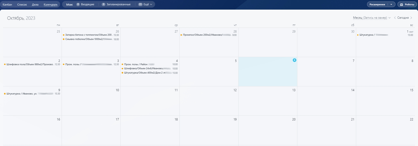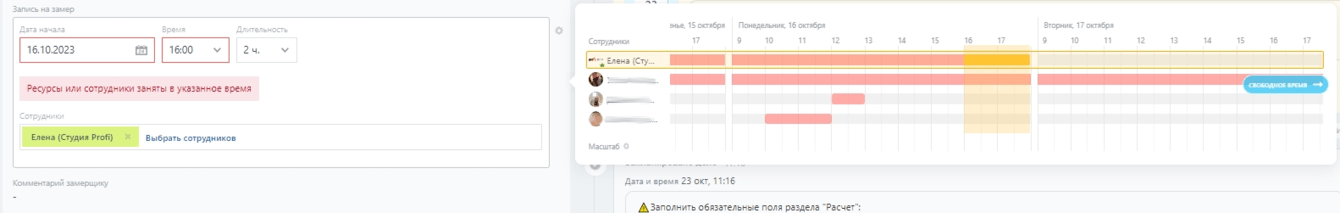Настроили запись на замер, где удобный планировщик покажет какие замерщики и в какое время уже заняты и какое время у них свободно.
