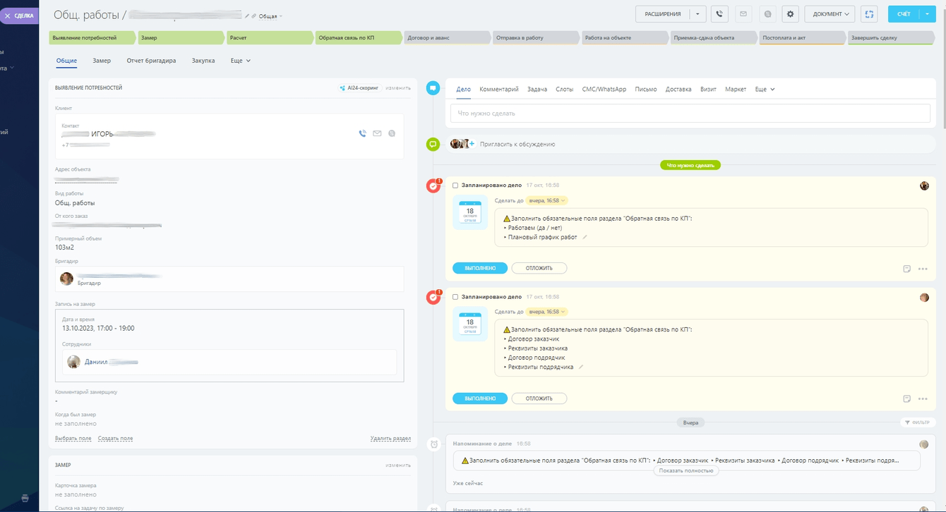 4. Все участники процесса: менеджер, замерщик, сметчик, юрист, финансовый директор, бригадир вносят каждый свои данные на всех этапах – при этом удобно смотреть от кого и на какой стадии ожидаются данные.