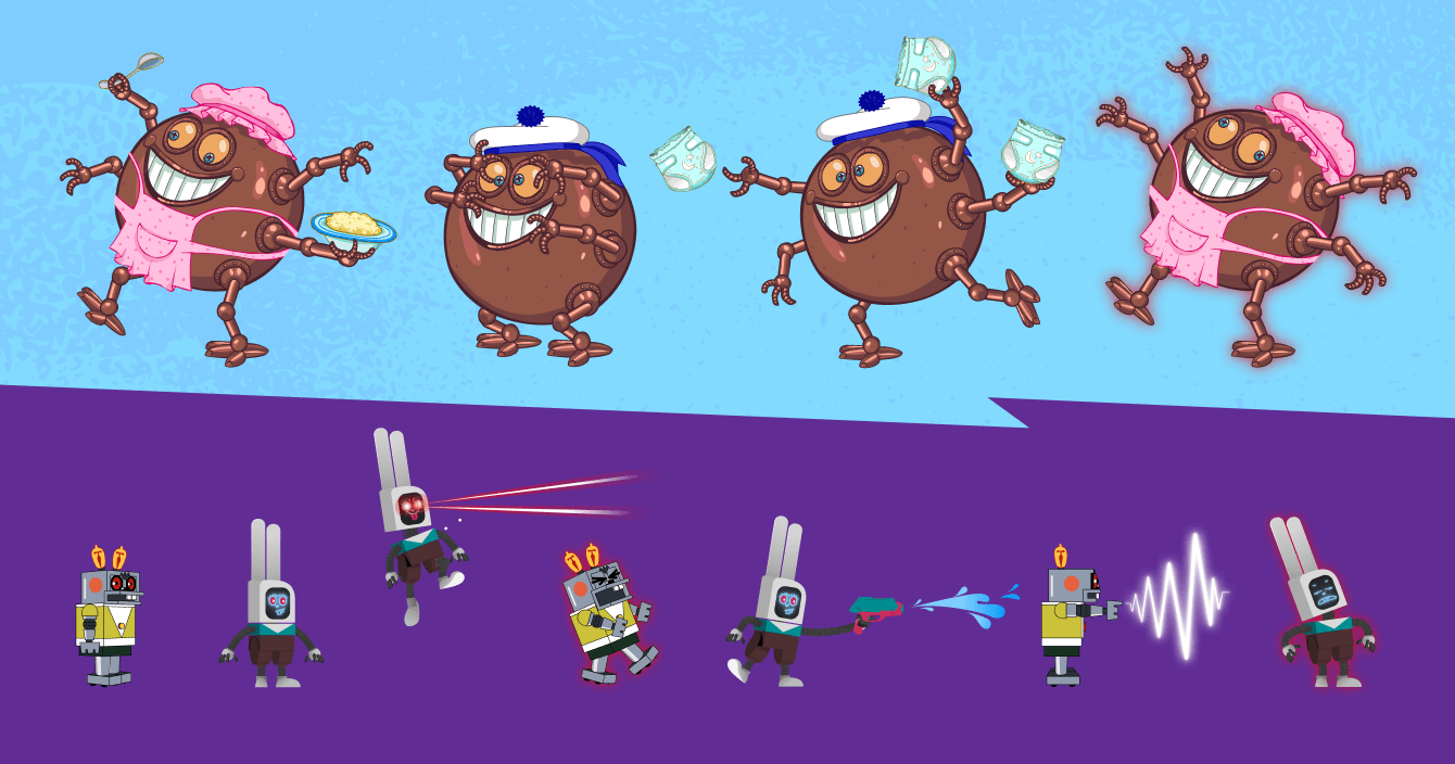 Изначально нам очень понравилась смелость клиента – использовать механику файтинга. Чтобы добавить глубины и вариативности, мы совместно с клиентом решили задействовать не просто по одному персонажу с каждой стороны, а разных героев из разных эпох мультфильмов. В итоге у нас получилось 4 персонажа, для каждого из которых были продуманы уникальные суперспособности: