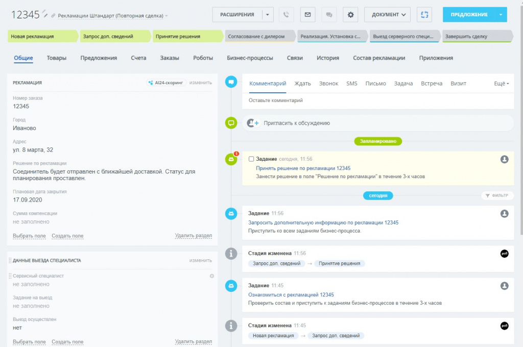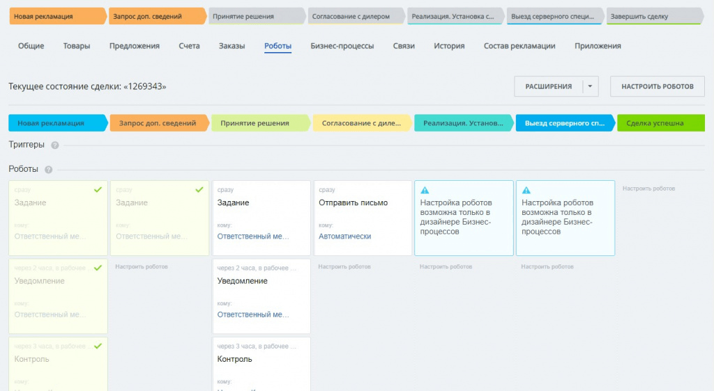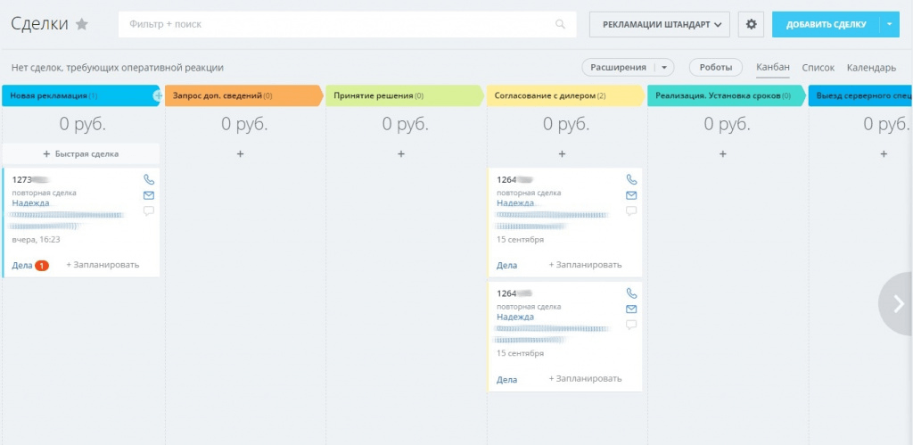 Мы проанализировали процесс обработки рекламаций и настроили соответствующие этапы в сделках.