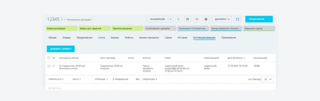 В карточке рекламации есть состав, подгружающийся при автоматическом создании сделки. В состав входят сами товары, фото, текст рекламации, вопросы и ответы.