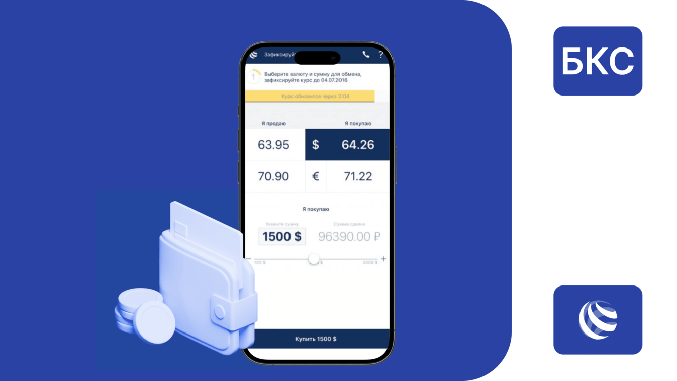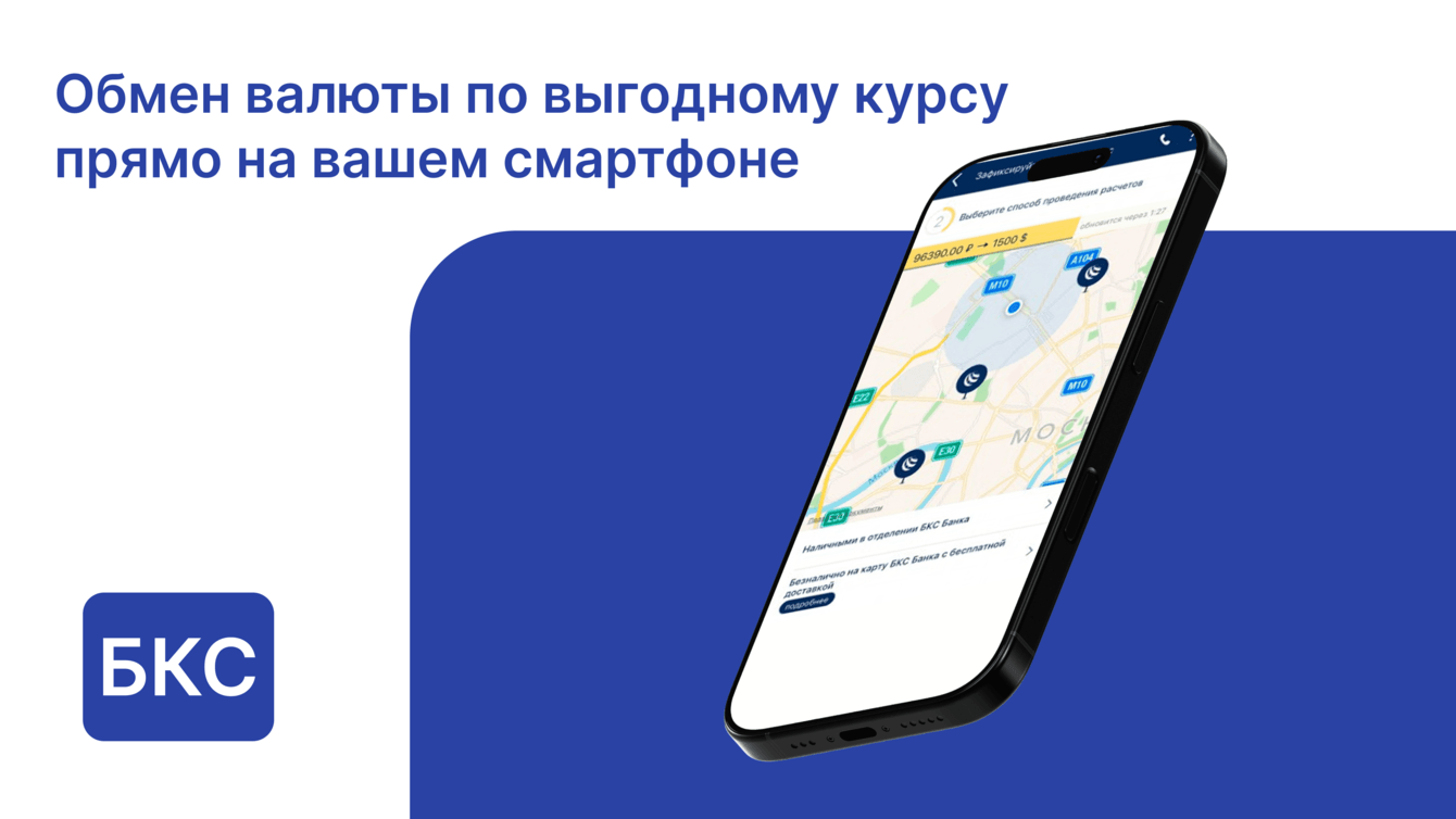 - Гибкость операций: Дать возможность зачислять валюту на счета в БКС или заказывать наличные с выбором отделения банка на карте.ё