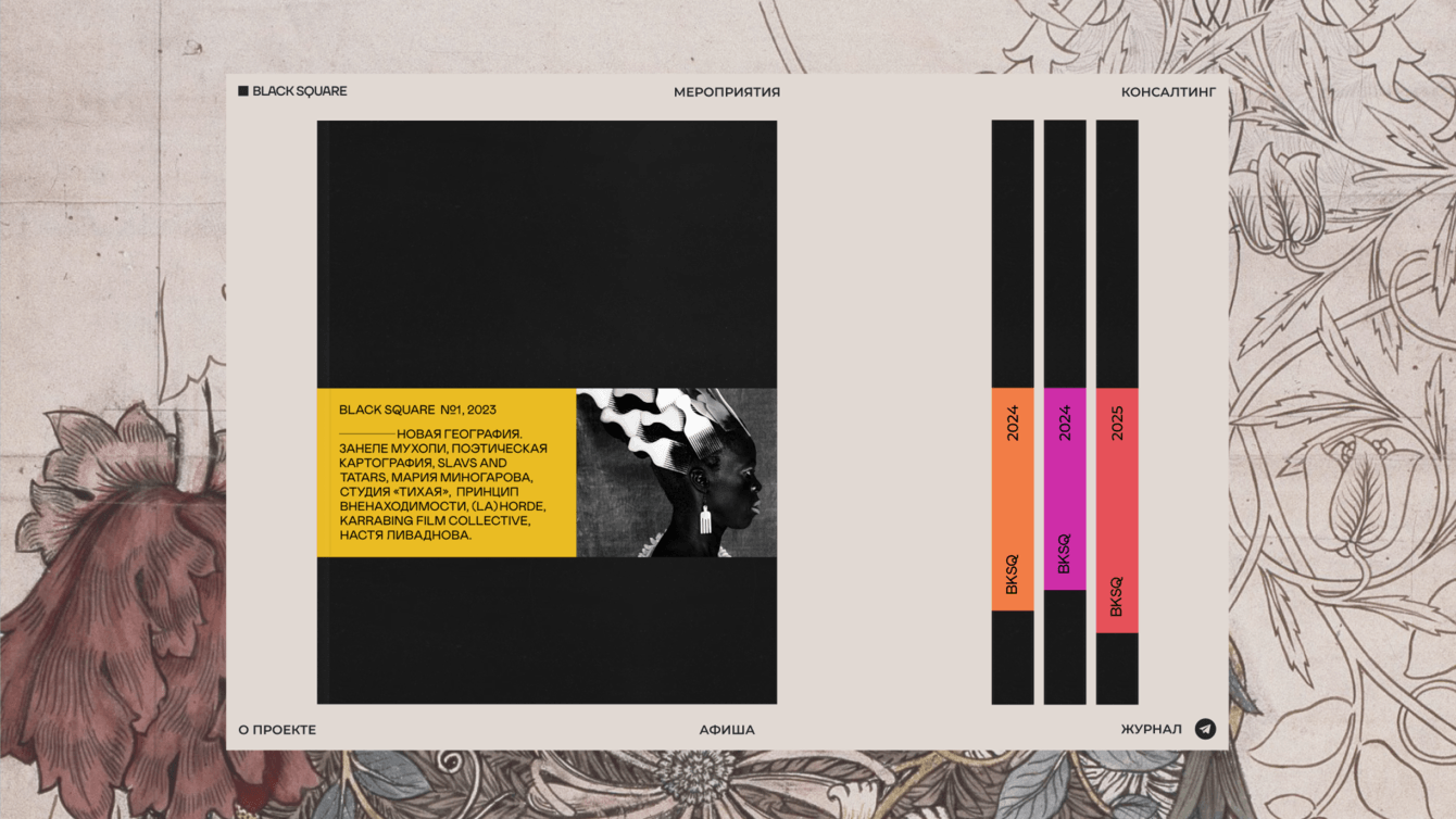 Нашей задачей было создать коллекционный сайт для коллекционного журнала. Такой, который одновременно сам станет частью проекта Black Square и в то же время раскроет все его грани, расскажет о направлениях деятельности и возможностях Black Square. Конечная цель — поддержать коммуникацию с текущей аудиторией и расширить её, привлекая новых читателей журнала, ценителей искусства и представителей бизнеса, интересующихся проектами в сфере культуры, искусства и моды.