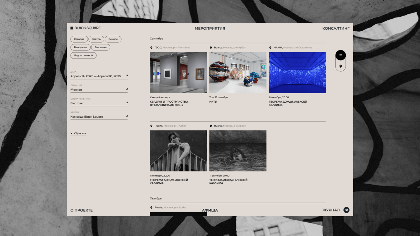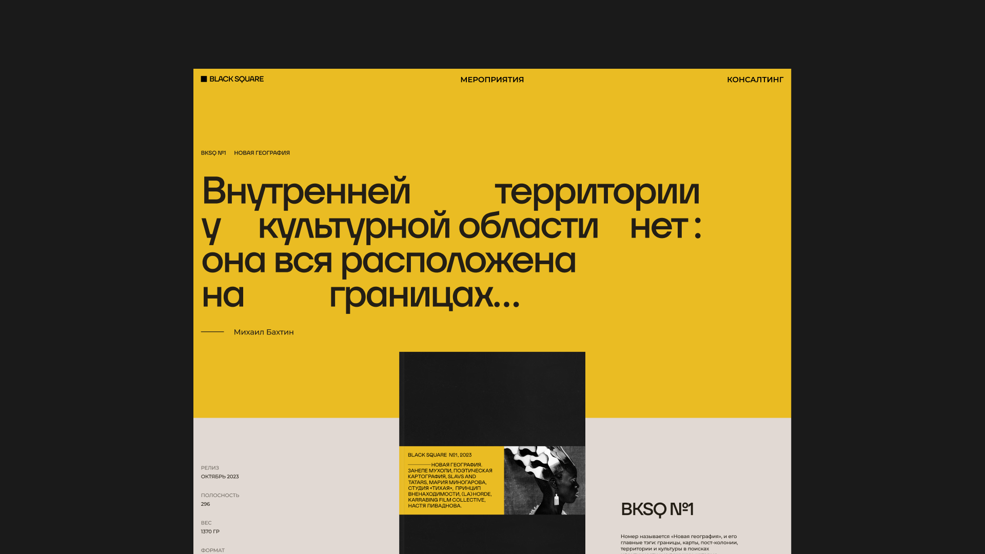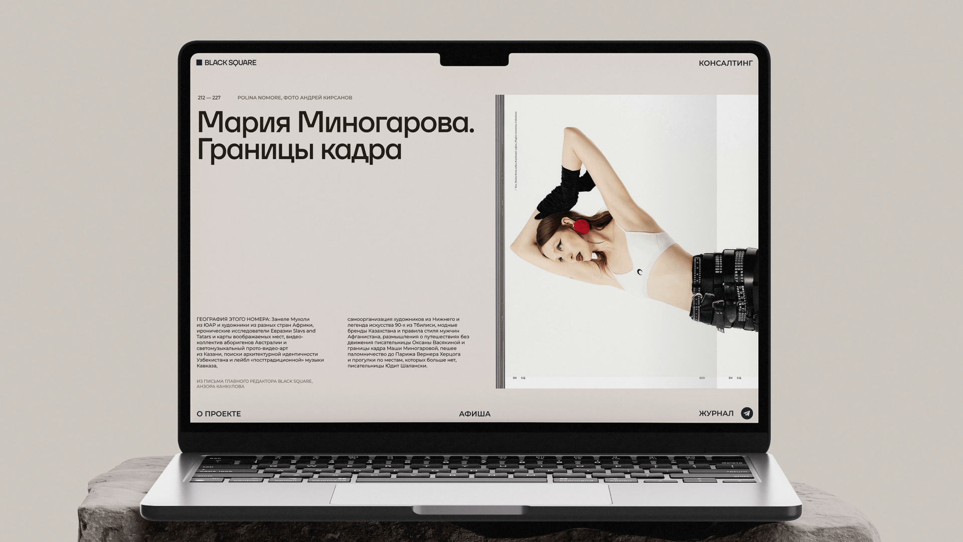 Нашей задачей было создать коллекционный сайт для коллекционного журнала. Такой, который одновременно сам станет частью проекта Black Square и в то же время раскроет все его грани, расскажет о направлениях деятельности и возможностях Black Square. Конечная цель — поддержать коммуникацию с текущей аудиторией и расширить её, привлекая новых читателей журнала, ценителей искусства и представителей бизнеса, интересующихся проектами в сфере культуры, искусства и моды.