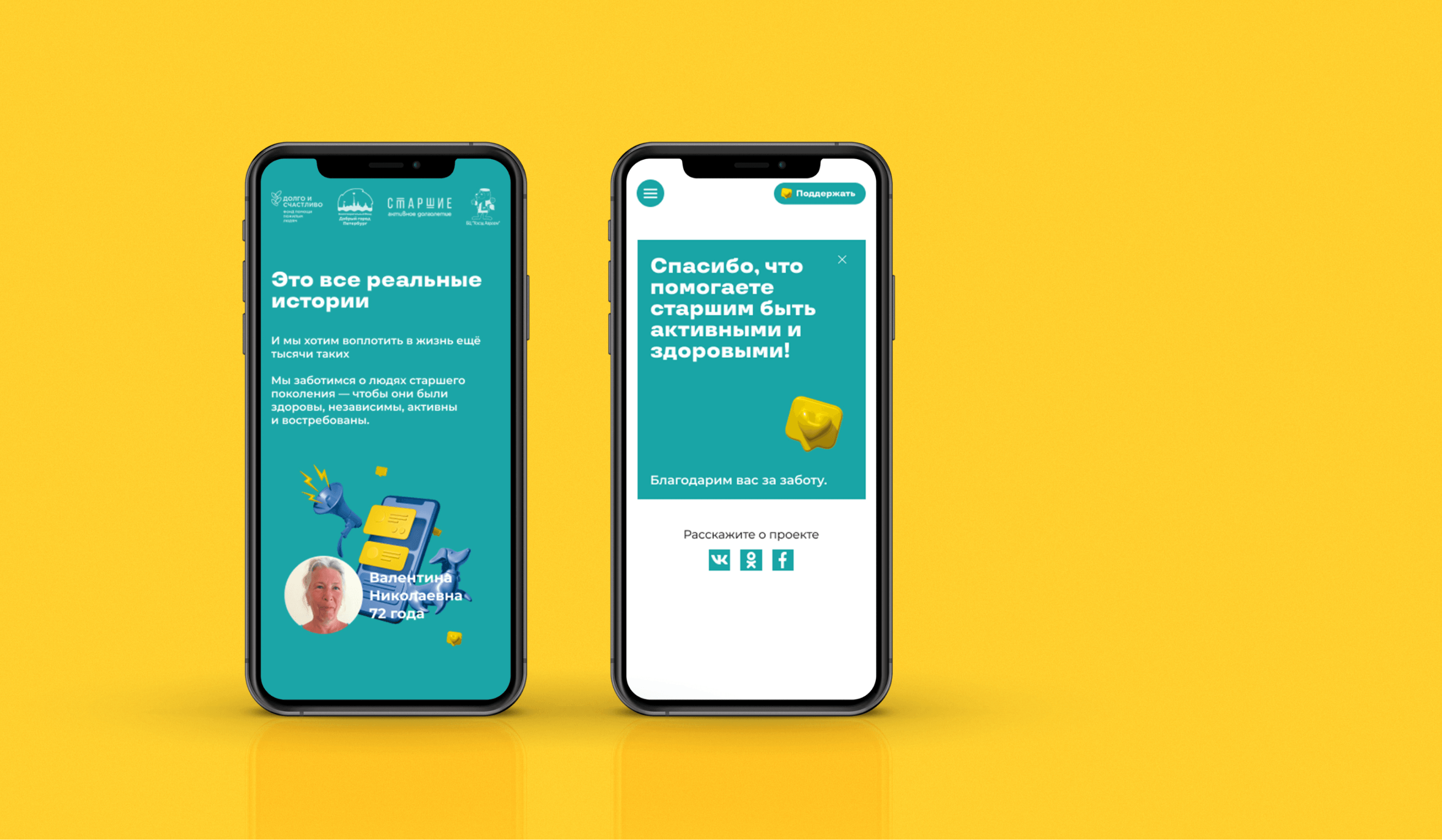 На этапе подготовки стратегии мы выделили две целевые аудитории и две параллельные задачи: необходимо привлечь к проекту как благотворителей, так и активных пенсионеров, готовых оказывать помощь другим.
