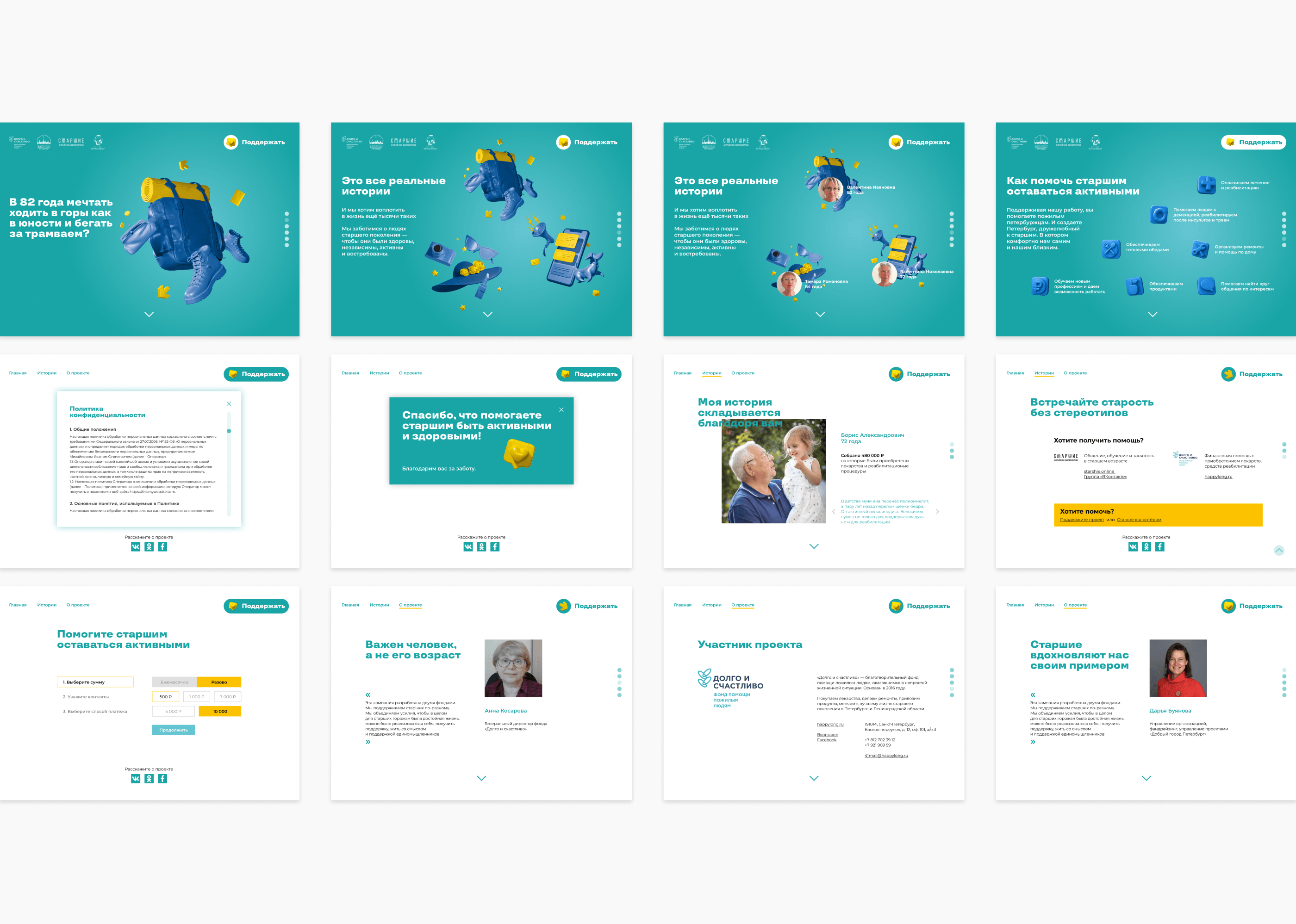 Креативная идея фокусирует внимание на том, что важен сам человек, а не то, сколько ему лет. Можно вести активный образ жизни, иметь нестандартные интересы и хобби в самом разном возрасте, вплоть до глубокой старости. Но пожилые нуждаются в различной помощи — в основном, связанной со здоровьем. Чтобы раскрыть эту идею, мы разработали серию кей-вижуалов с историями подопечных. Это истории самых обычных людей — узнав о них поближе, можно вдохновиться их примером и отношением к себе и окружающим.