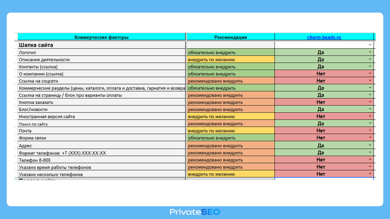 Провели глубокий аудит коммерческих факторов ранжирования и сравнили сайт с прямыми конкурентами. По результатам аудита выявили нехватку элементов доверия.