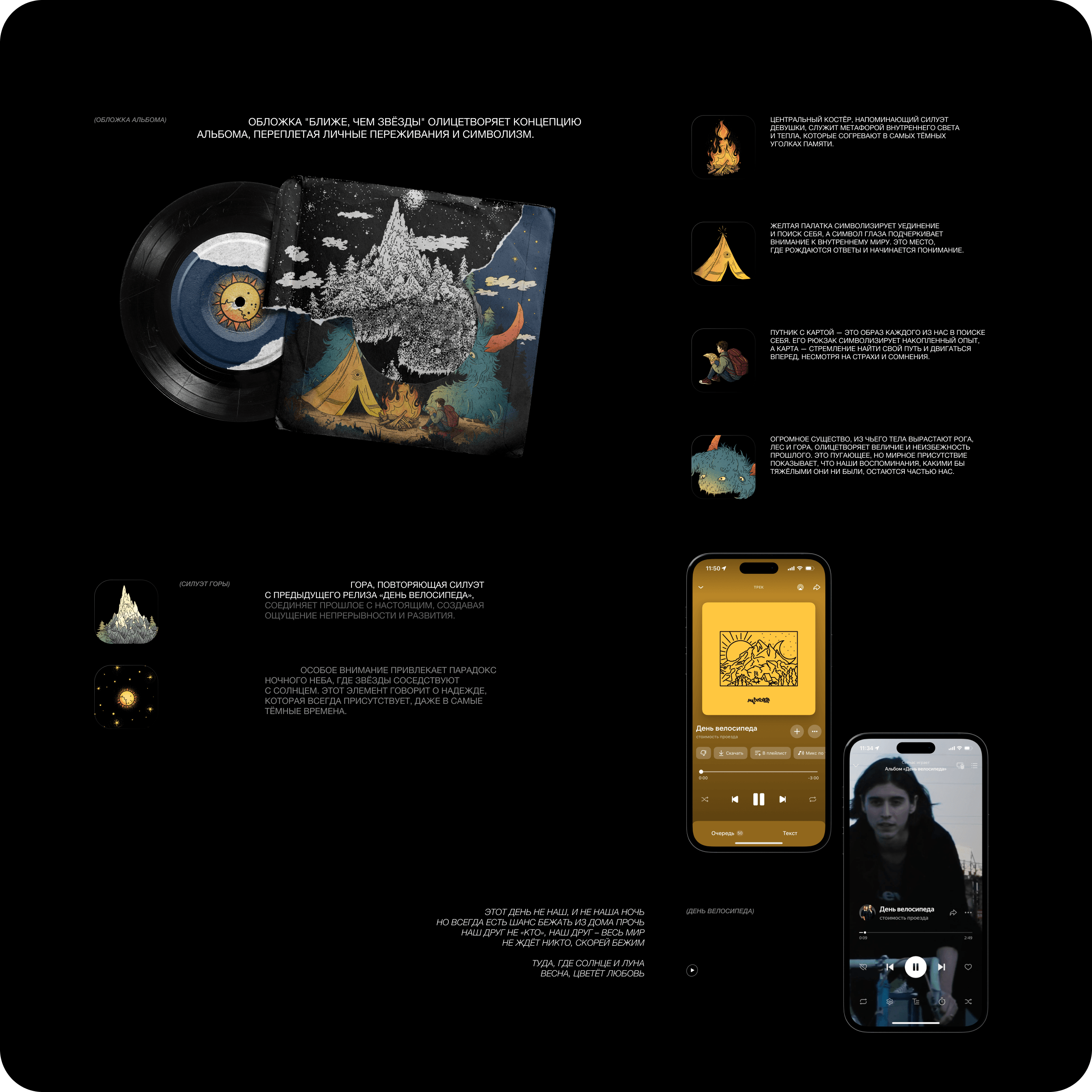 Проект объединяет музыку и визуальный стиль в многослойную вселенную, где каждый элемент — от звука до печатного носителя — создаёт единый опыт восприятия альбома.