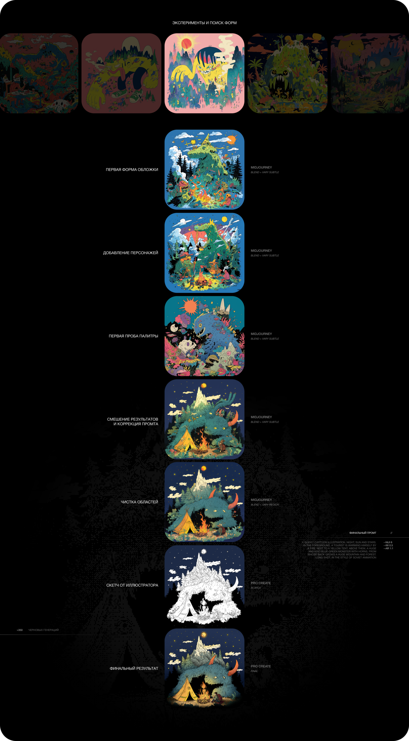 Мы обучили нейросеть на лучших референсах, получили первые прототипы, доработали их вручную и передали иллюстратору, который добавил финальные штрихи и гармонию цвета.