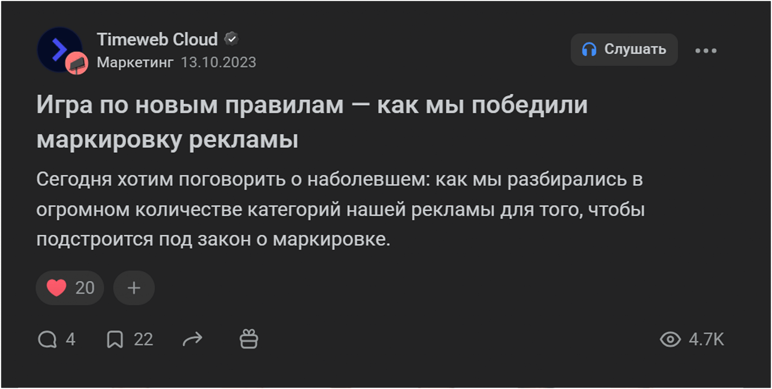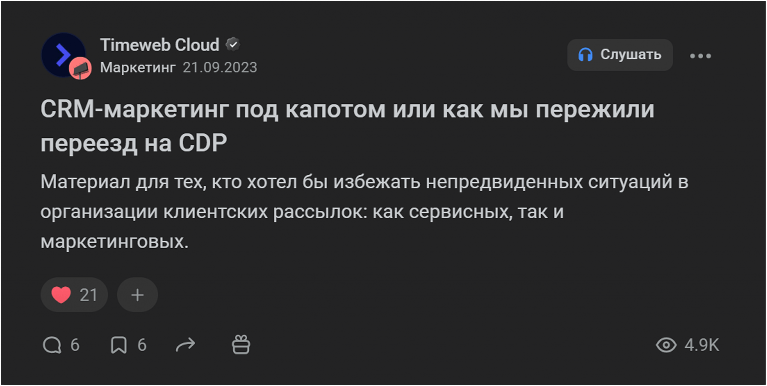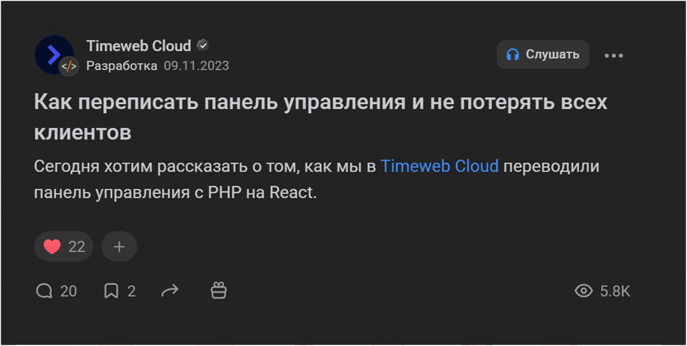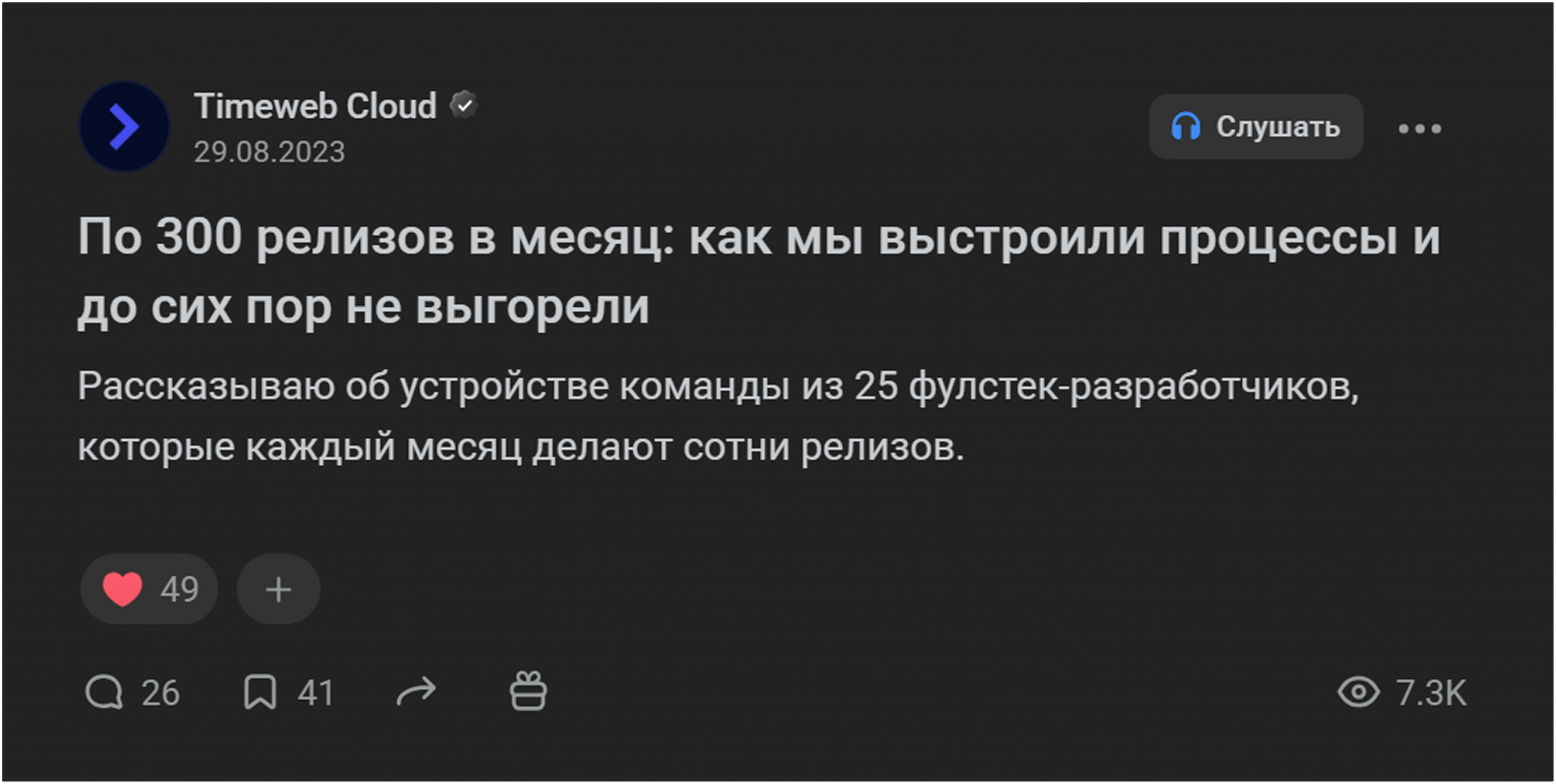 У Timeweb Cloud уже был корпоративный блог на VC, но охваты статей не дотягивали до нужного уровня — в среднем не больше 400 просмотров на публикацию. При этом у команды было четкое понимание, о чем писать, но им не хватало экспертизы в подаче, которая бы привлекала и удерживала аудиторию.