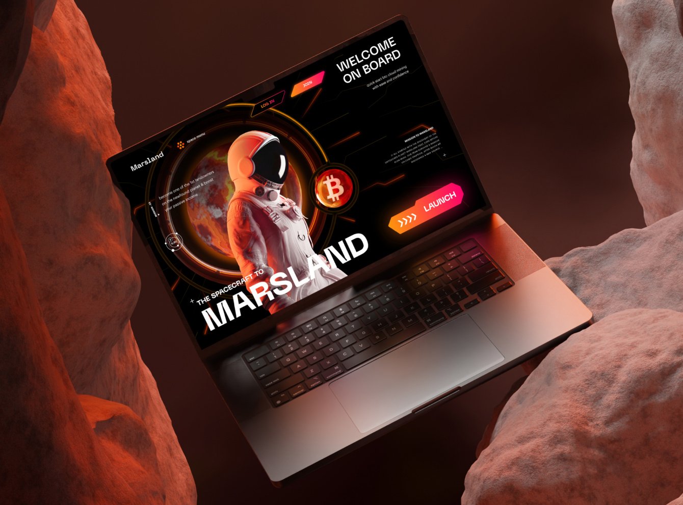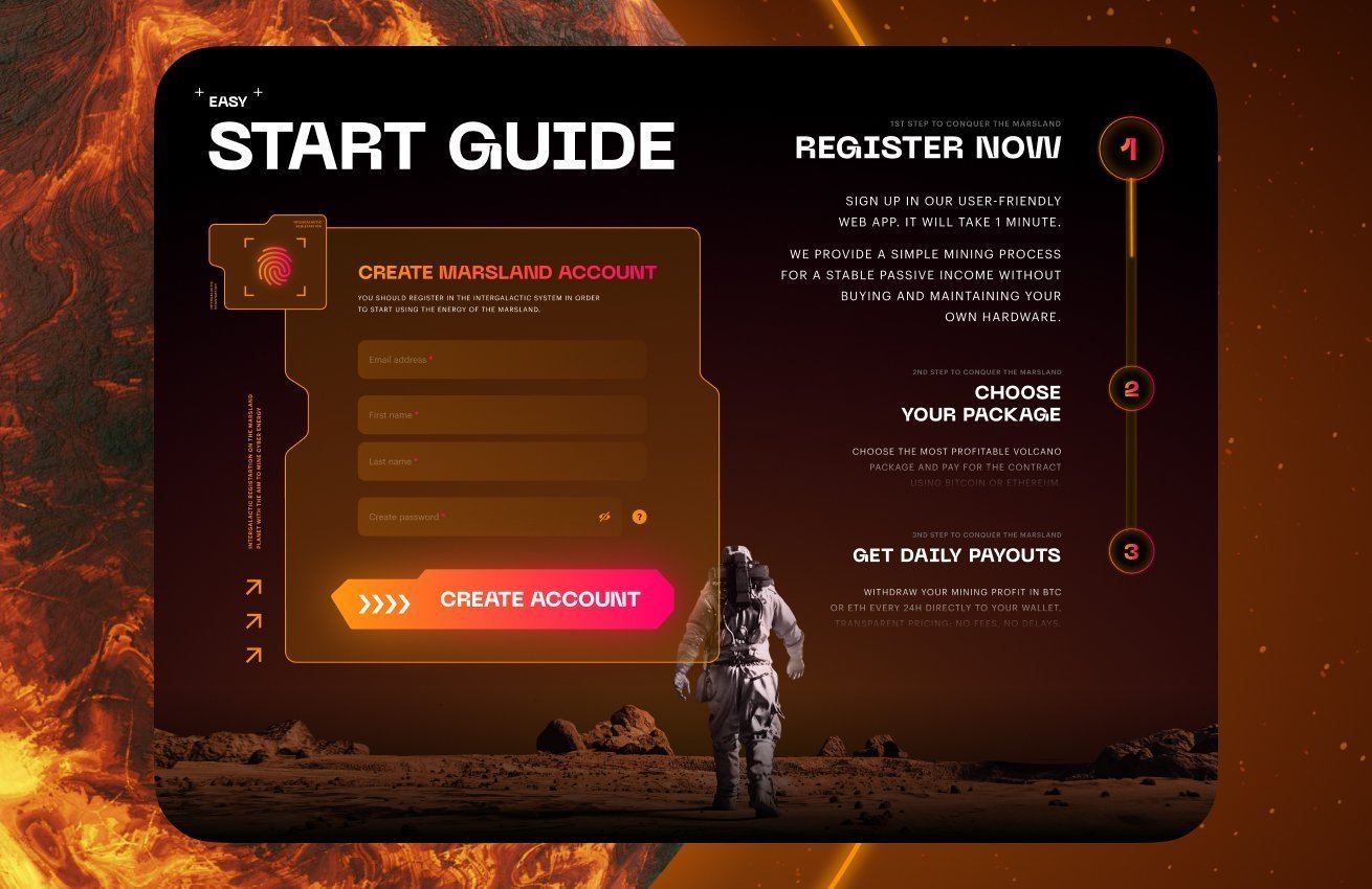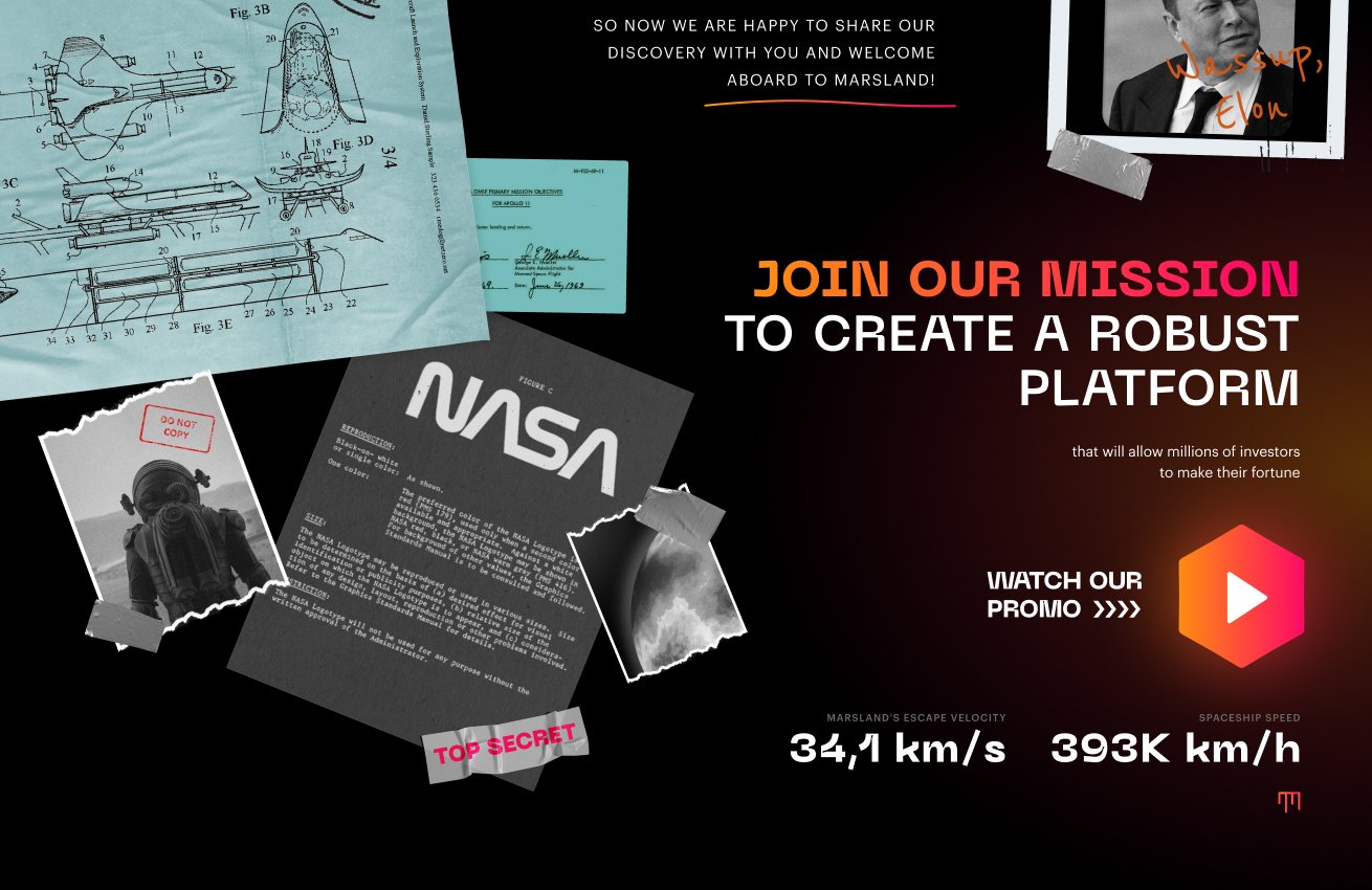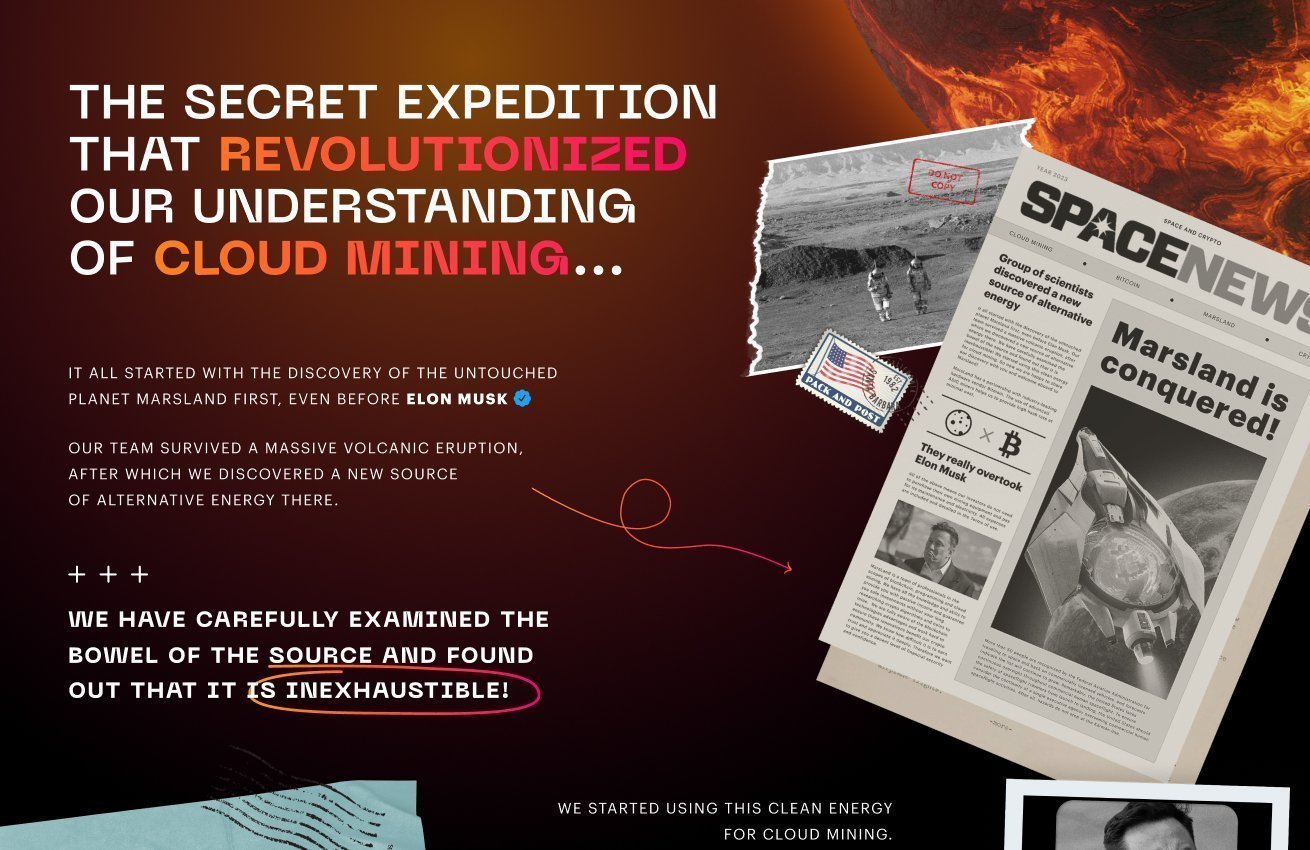 Пользователь заходит на сайт и сразу же принимает роль участника секретной экспедиции на планету Marsland — экспедиция призвана перевернуть привычное понимание об облачном майнинге.