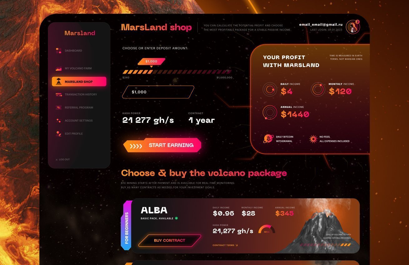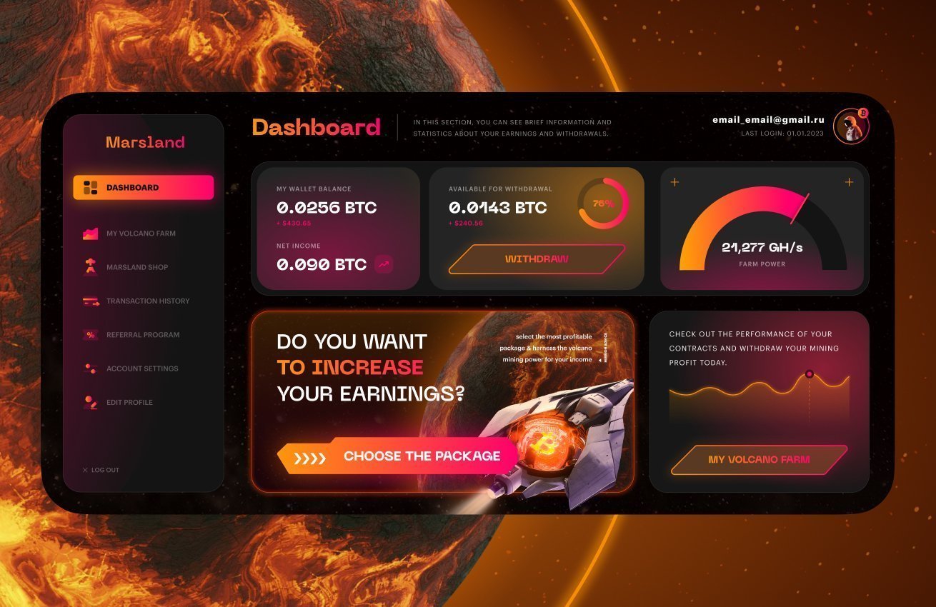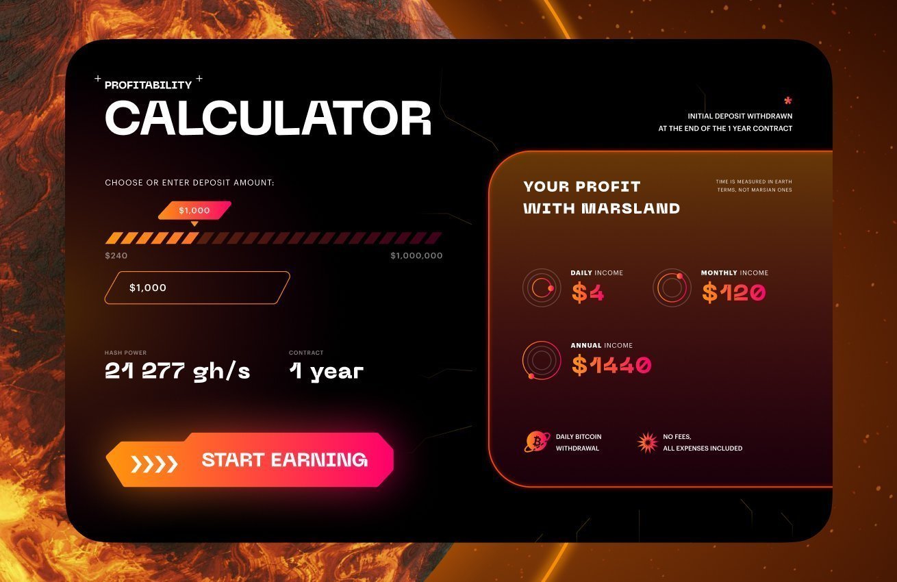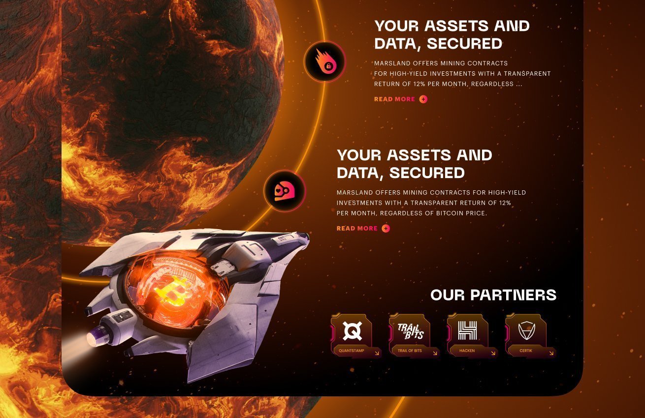 Пользователь заходит на сайт и сразу же принимает роль участника секретной экспедиции на планету Marsland — экспедиция призвана перевернуть привычное понимание об облачном майнинге.
