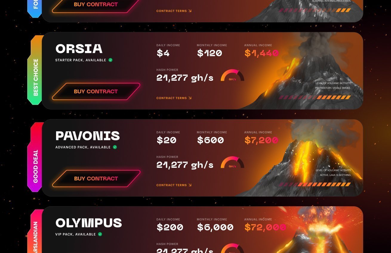 Исследователь источника aka пользователь может выбрать вулкан aka тариф с интересующей его мощностью энергии: названия отсылают к реальным действующим вулканам на планете Земля. Вулканы разбиты по типу активности и это даже отображено в их визуальном облике: