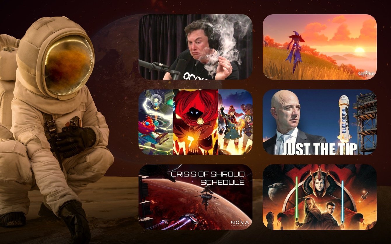 Общие тренды: экология, анимэ, игры и фильмы о магии или магических существах, эстетика космоса, Илон Маск, игры с разного рода менеджментом, казино.