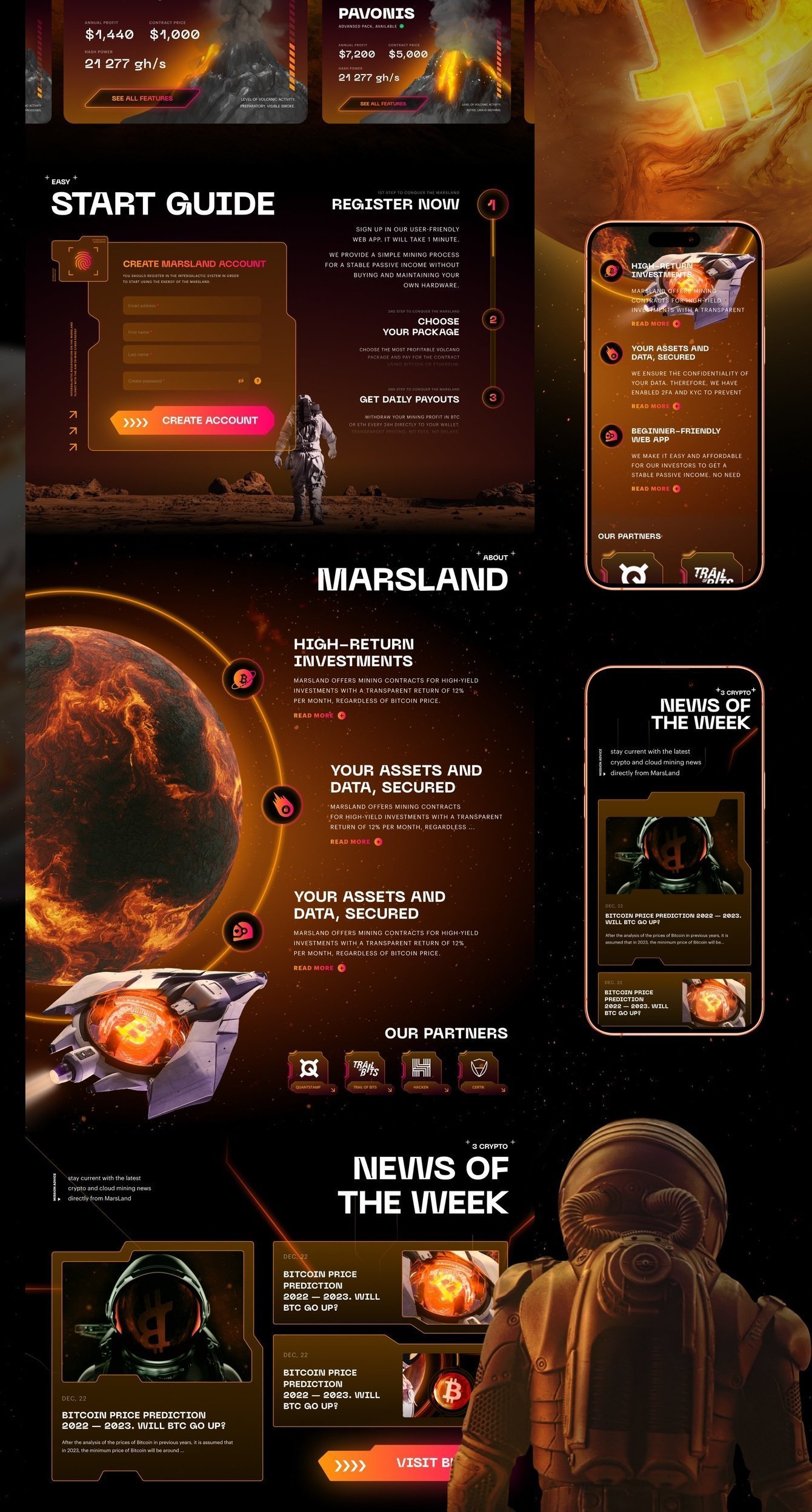 Необычное оформление кнопок CTA, регистрации, логина и меню, маленькие декоративные детали как будто из киберпанка и, наконец, высокоуровневый визуал в виде космонавта на фоне иллюминатора и планеты Marsland — в эту историю хочется верить, на эту планету хочется попасть.