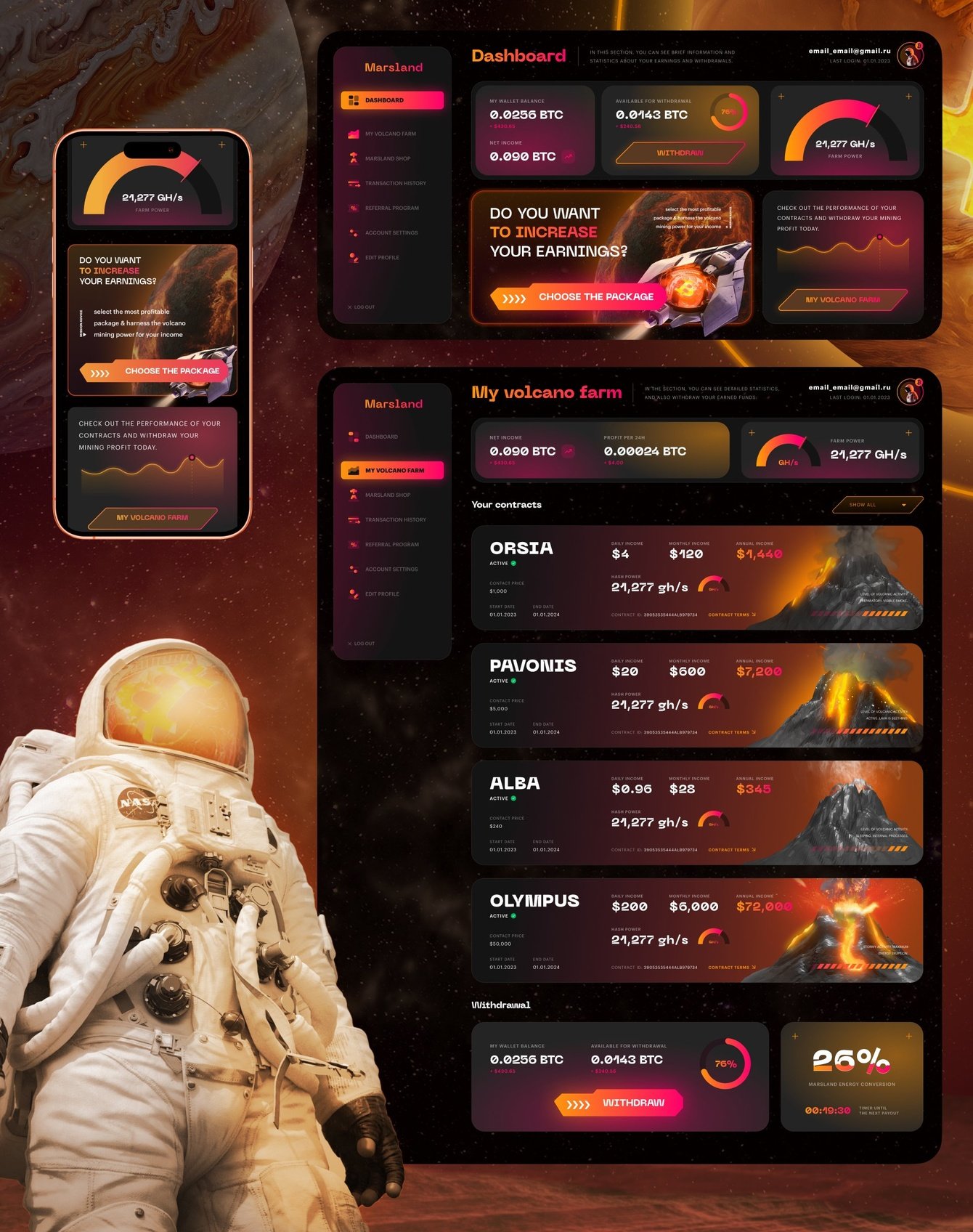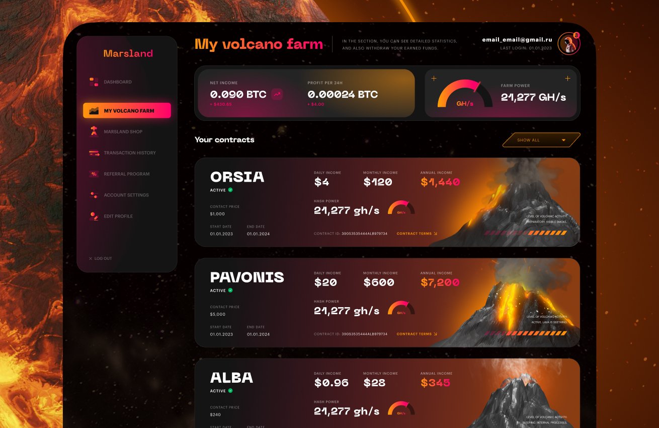 Уже по дашборду видно: UI-дизайнер вдохновлялся масштабом и эстетикой игровых дизайнов. На главной панели собраны: статистика за последние сутки, сводка по мощности фермы, функция вывода средств, форма, мотивирующая на покупку нового тарифа, чтобы снизить количество выводов профита с площадки. Весь визуал оформлен тематически и интерактивно — как и в примере с главной страницей, в дашборд внедрены микроанимации, которые ненавязчиво управляют вниманием пользователя и вызывают у него ощущение активной работы и отклика системы.