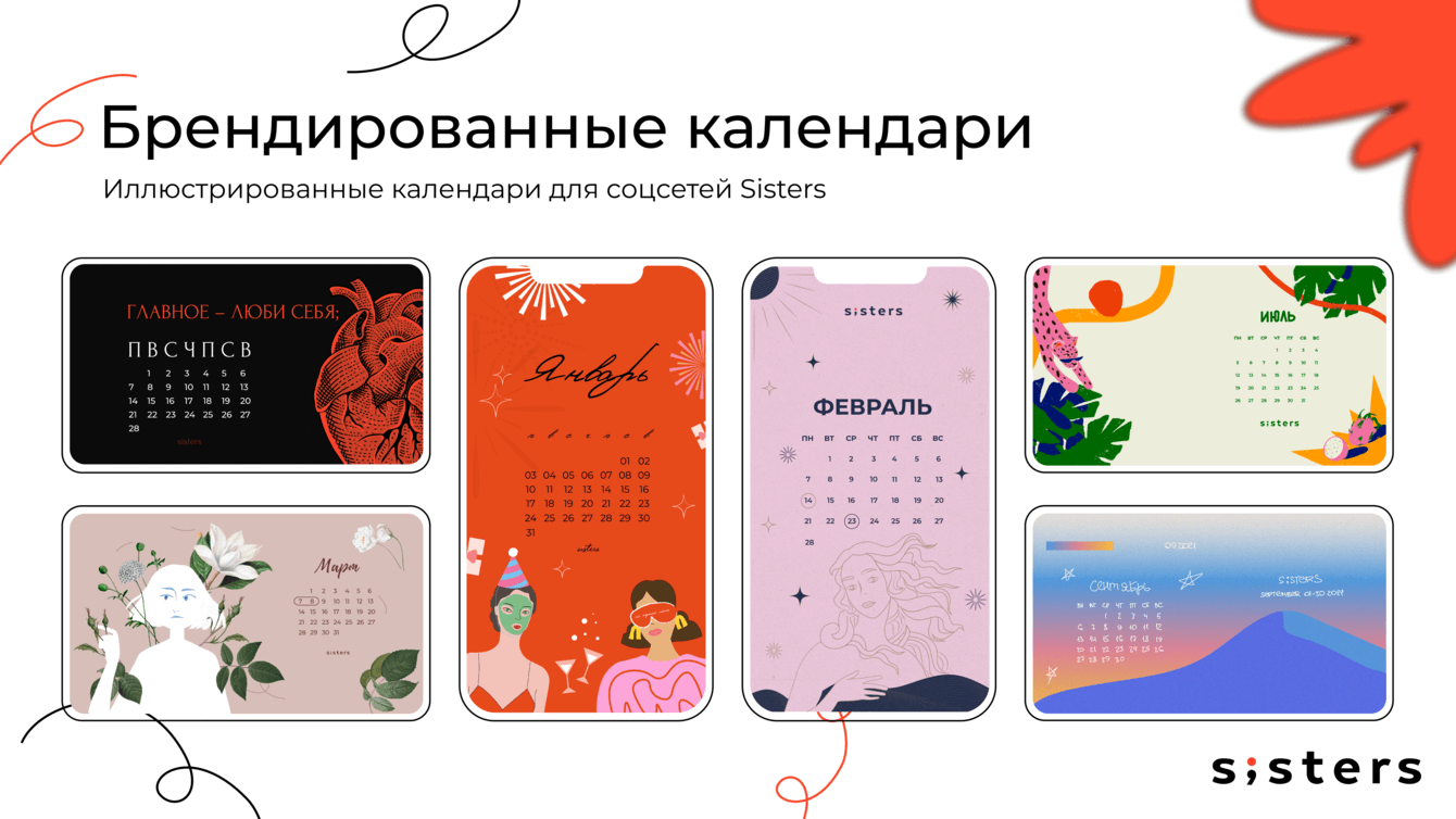 • Создание иллюстрированных календарей для креативного агентства Sisters (ежемесячно)
