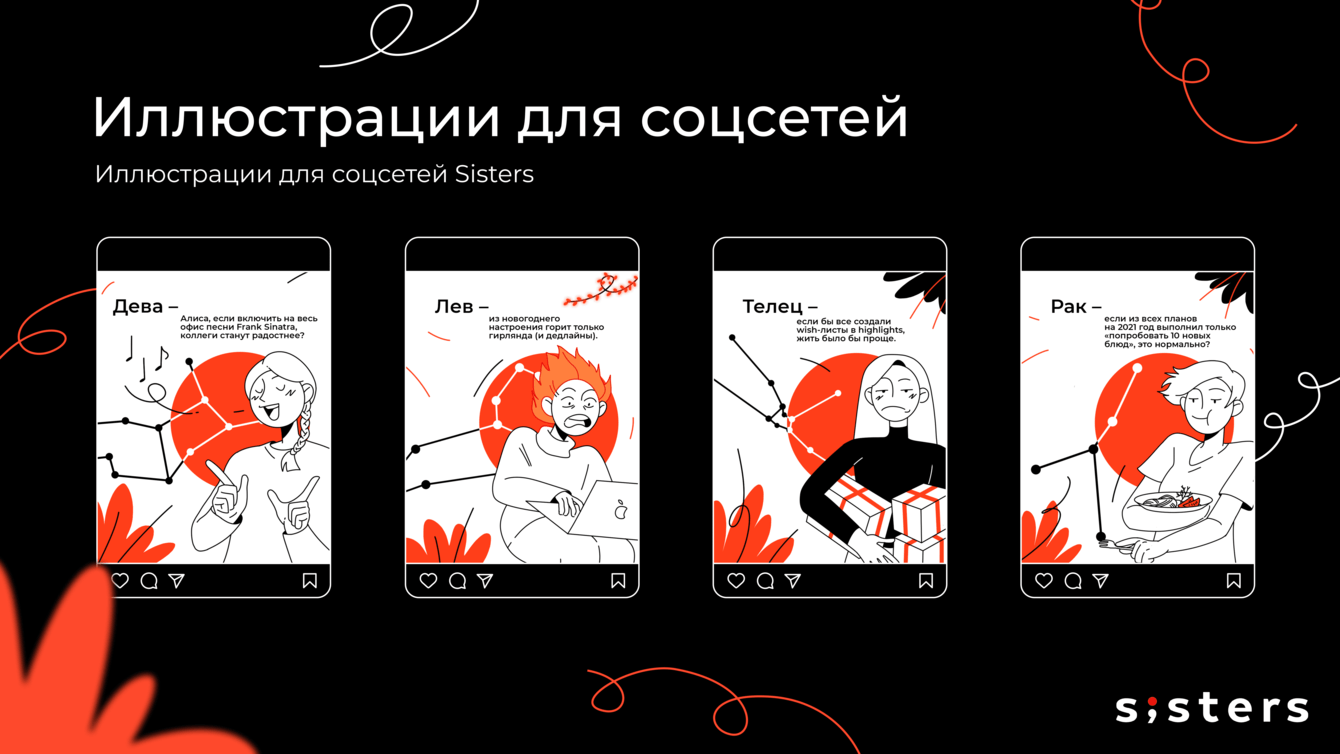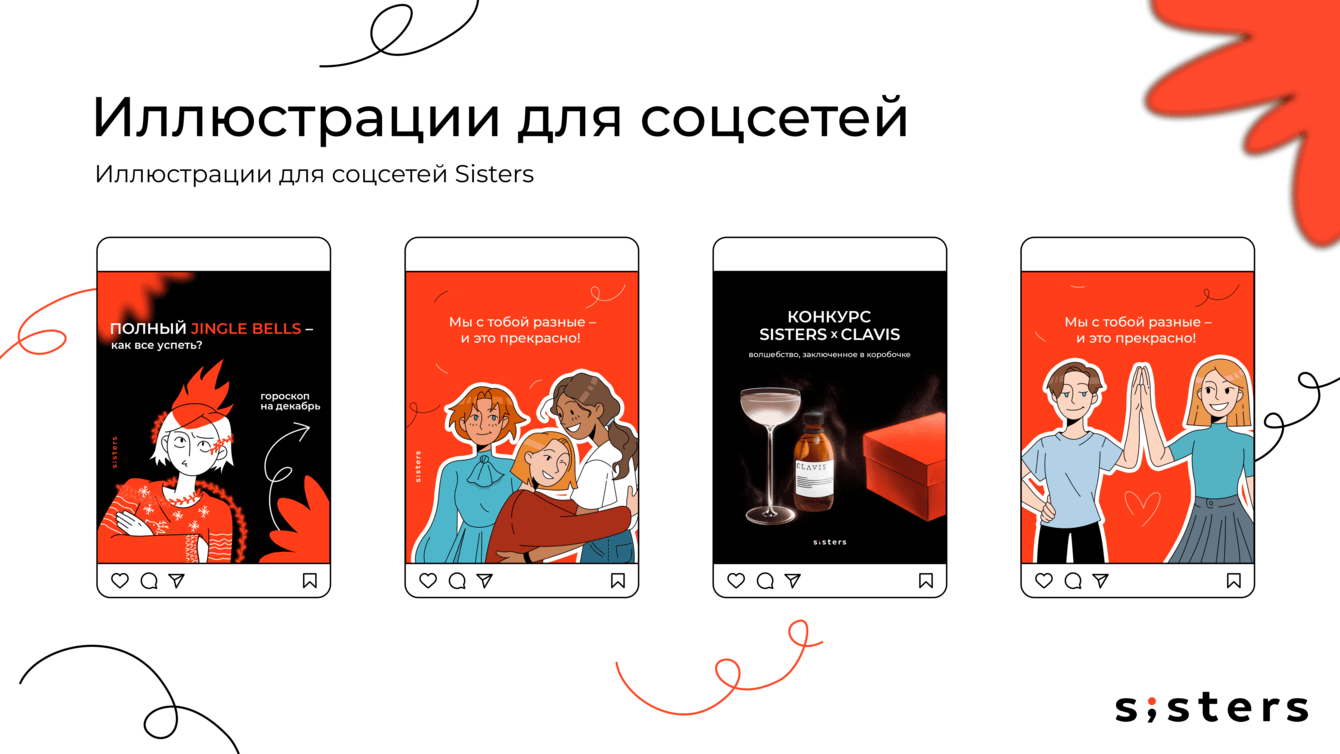 • Создание фирменного стиля для социальных сетей креативного агентства Sisters (отрисованные персонажи/фирменные детали)