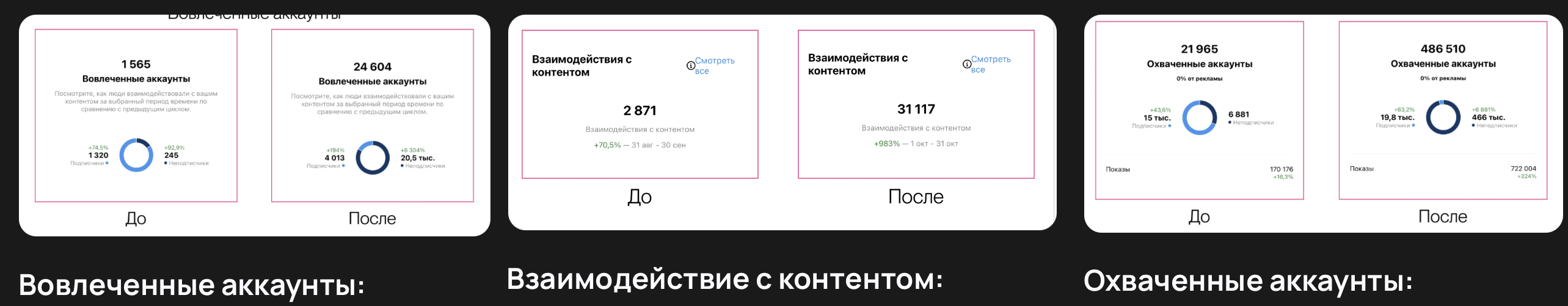 Благодаря этим мерам удалось значительно увеличить охваты, вовлеченность и общее число подписчиков, а также сформировать устойчивую систему генерации заявок через социальные сети.