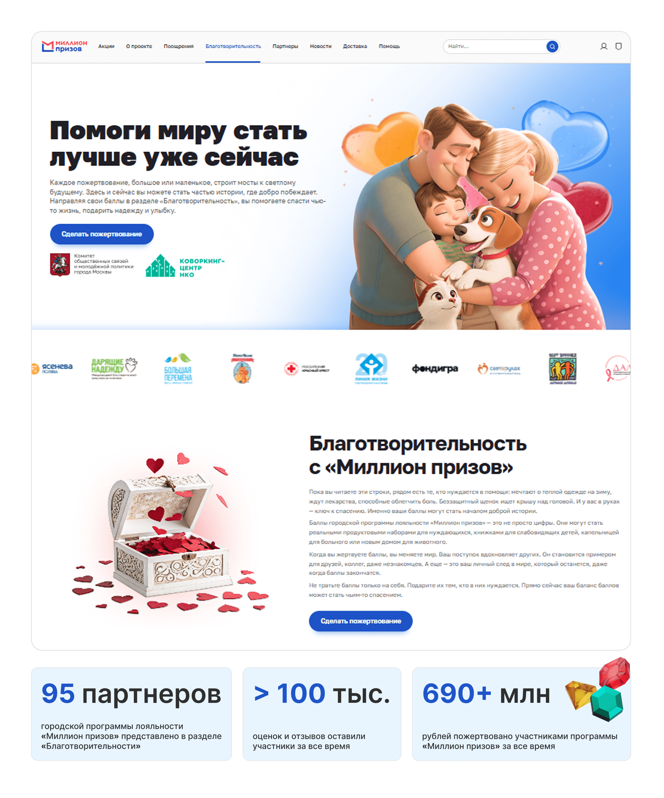 Программа «Миллион призов» решает городскую задачу по повышению регулярной вовлеченности жителей в управление городом и целостности обратной связи: многим горожанам важно, чтобы участие в голосованиях и городских сервисах было простым, понятным и имело признание и благодарность. Цель программы — сделать участие в цифровых проектах Москвы привычной частью повседневной жизни и поддержать его понятной системой поощрения: за действия в сервисах (например, в проекте «Активный гражданин») начисляются баллы, которые можно обменять на предложения партнеров программы или направить на благотворительность. Ограничение прежних подходов — отсутствие устойчивой мотивации и видимой «отдачи» от участия, из-за чего многие включались эпизодически.