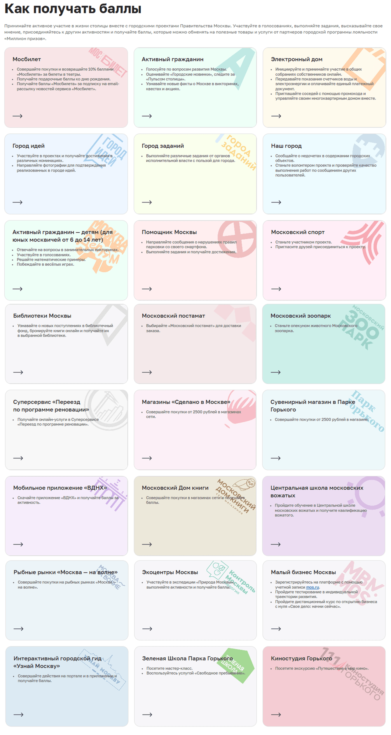 Баллы начисляются и офлайн — за покупки на рыбных рынках «Москва — на волне», в магазинах «Сделано в Москве» и «Московский дом книги», получение заказов через «Московский постамат», участие в городских мероприятиях и другие активности. Всего на данный момент получение баллов доступно в 24 различных проектах и сервисах.