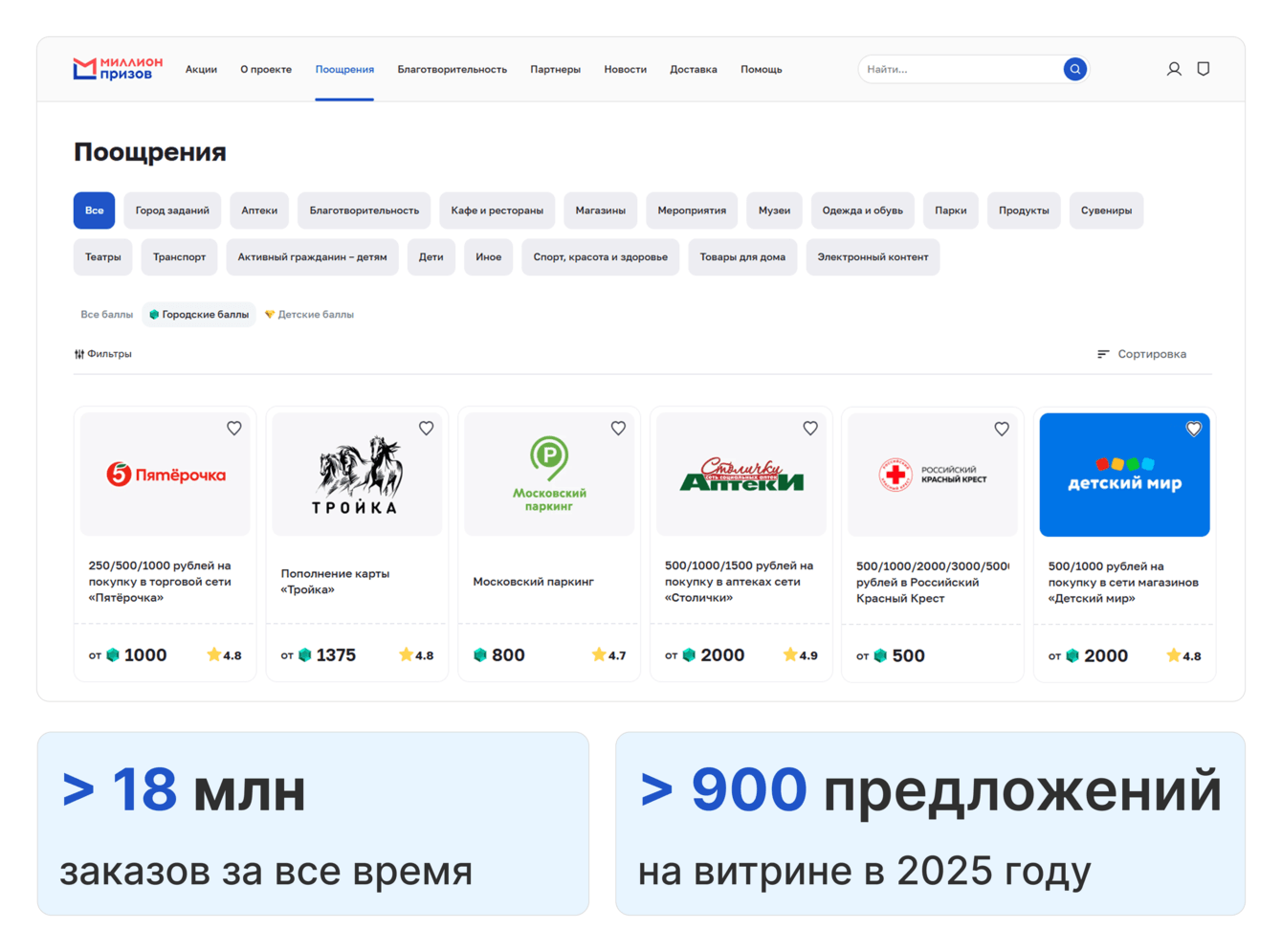 «Миллион призов» формирует в Москве устойчивую цифровую экосистему вовлеченности: жители получают баллы за участие в городских электронных проектах и офлайн-активностях и используют их для получения приятных или полезных товаров и услуг у партнеров или направляют на благотворительность. Масштаб изменений подтверждается ключевыми показателями программы: она объединяет более 5 млн москвичей, которые совершили более 18 миллионов заказов. В 2025 году на витрине было доступно более 900 предложений.