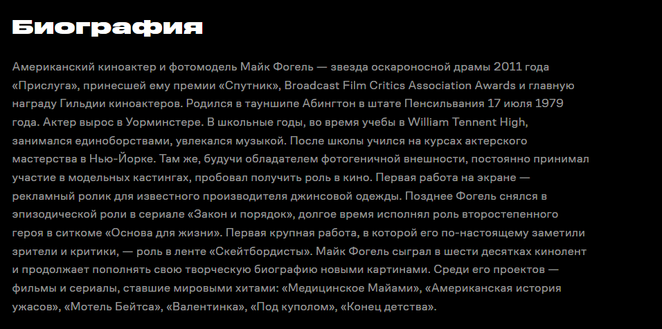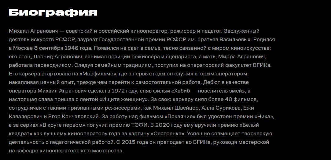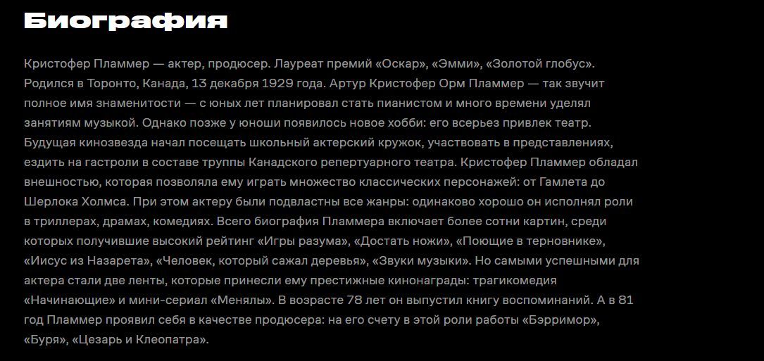 По требованиям проекта все биографии должны быть уникальными, написаны по определенной структуре в едином стиле. Сложность вызывали особенно биографии известных персон — нужно было придерживаться заявленного уровня уникальности, при этом не упустить важных моментов: перечислить основные работы в фильмографии, награды и прочее. Мы создали гайд для авторов, где прописали все основные проблемы и дали рекомендации, как можно их решить.