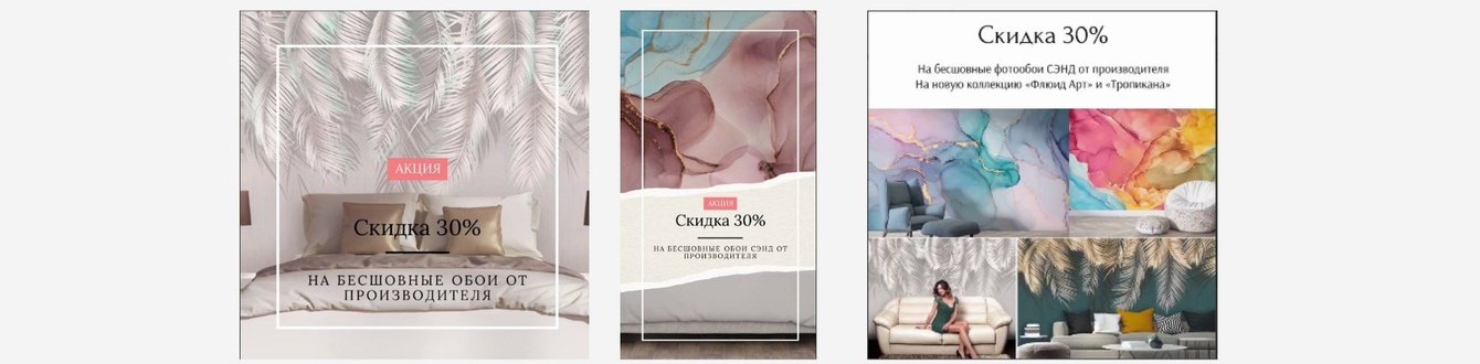 В рамках первых тестов мы создали несколько креативов с информацией о скидке, а также использовали стандартные изображения с самого профиля без призывов и офферов. Лучший CTR – более 2,4%, показали видео с разными видами обоев, слайдшоу. Также тестировали карусели, но их результаты были хуже.