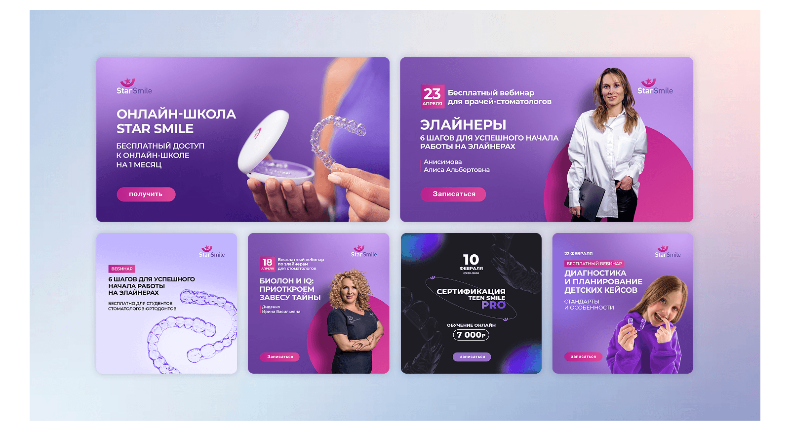 Для Star Smile мы привлекали врачей для сотрудничества через VK Реклама. Задача была в том, чтобы найти узкую аудиторию — стоматологи-ортодонты. В качестве ключевого оффера — регистрация на бесплатные обучающие вебинары.