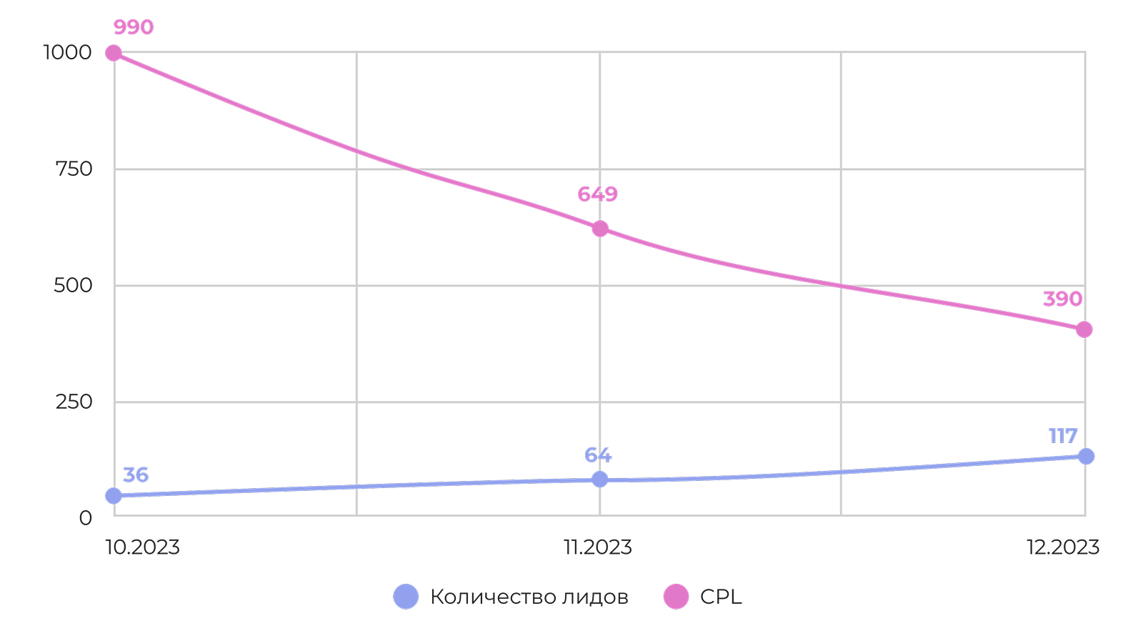 В первые 3 месяца работы, нам удалось снизить CPL с 990 руб. до 390 руб. с НДС, при этом качество лидов составило ~90%, то есть: до лида дозвонились, подтвердили, что он/она врач, записали на обучение, начали сотрудничество.