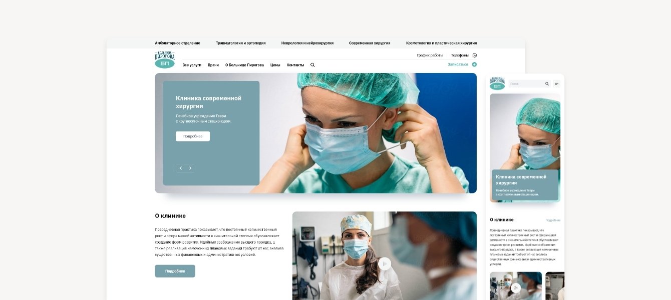 «Больница Пирогова» — это современный лечебный центр, включающий в себя несколько медицинских направлений. Для размещения информации об услугах и повышения лояльности клиентов, мы разработали новый сайт с современным интерфейсом, удобной навигацией и адаптивностью под любые экраны.