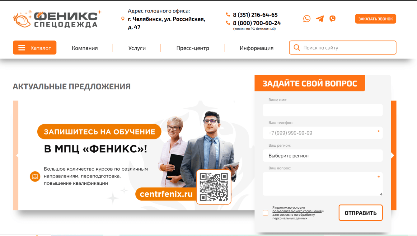 «Феникс-Спецодежда» — компания, которая занимается продажей спецодежды, спецобуви и СИЗ. Головной офис находится в Челябинске, есть представительства в других городах России. Клиент пришел к нам в 2023 году на SEO-продвижение, доработку сайта и техподдержку.