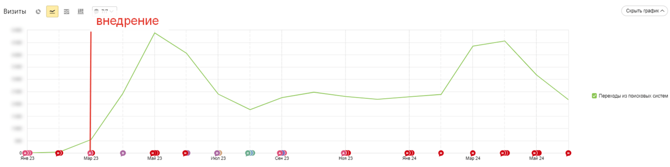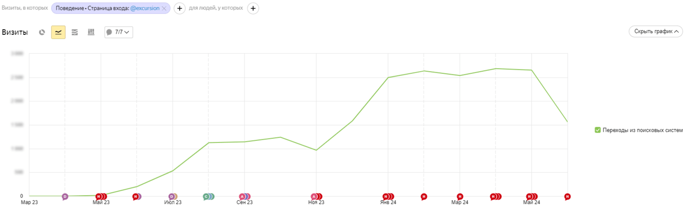 Чтобы наш клиент смог завоевать долю трафика у гигантов-агрегаторов, мы сосредоточились на расширении семантического ядра. Опыт показывает: если кажется, что в нише мало семантики, это только кажется. Надо копать глубже: искать дополнительный спрос, собирать тематические и околотематические ключи, создавать и оптимизировать новые страницы. Не стоит пренебрегать информационными ключами и трафиком, тем более сейчас, когда с помощью ИИ при грамотном подходе можно быстро сгенерировать много качественного контента.