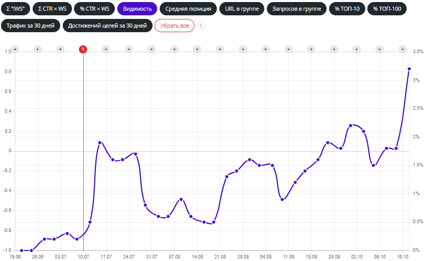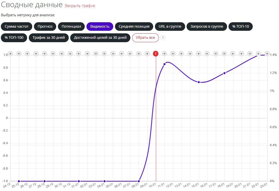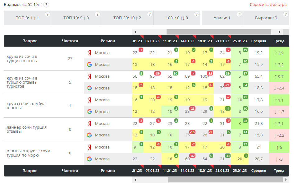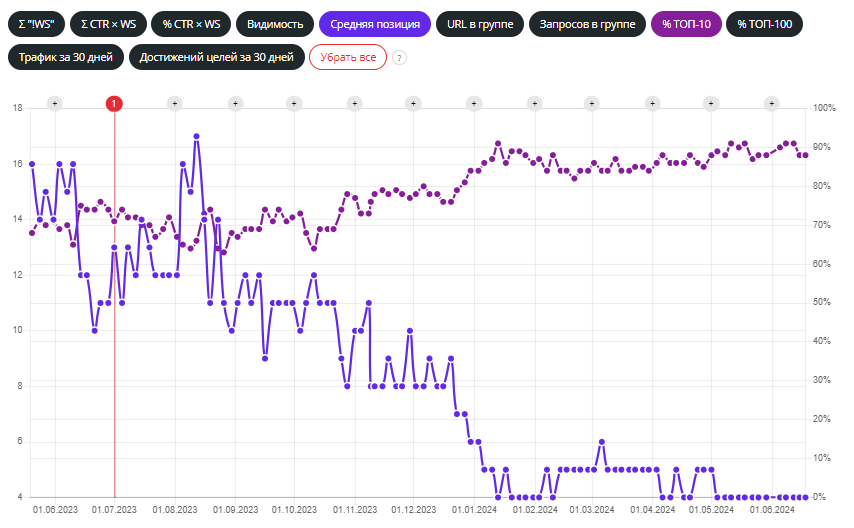 Получили довольно противоречивый результат: рост процента запросов в ТОП-10 и снижение средней позиции по запросам из группы.