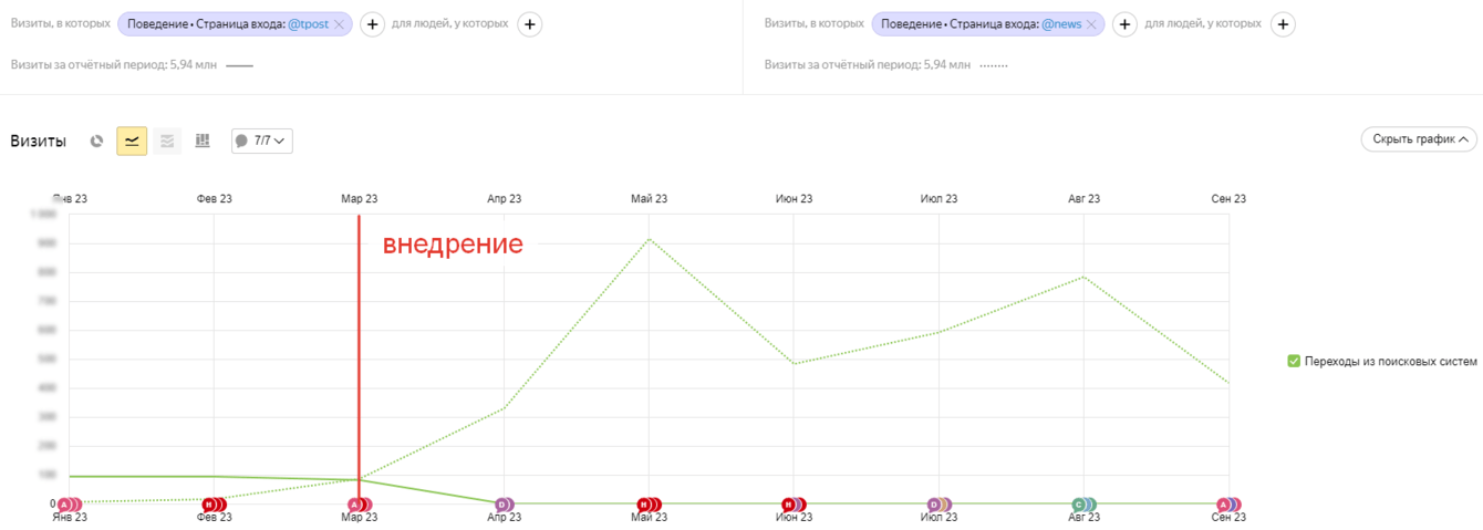 В результате мы получили резкий рост поискового трафика на новостные страницы.