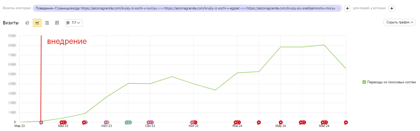 После того, как у клиента открылись новые направления — Египет и Греция, мы собрали соответствующую семантику. Дополнительно был обнаружен поисковый спрос с интентом на круизы по морям. В каталоге были созданы новые оптимизированные страницы под группы запросов: